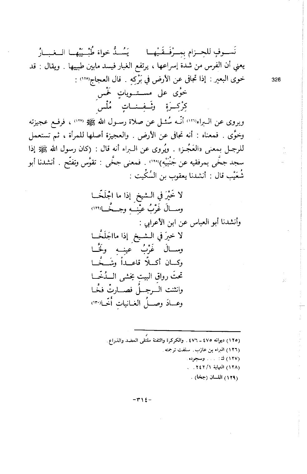 ويروى عن البراء (126) أنّه سُئل عن صلاة رسول الله (127) فرفع عجيزته وخوَّى. فمعناه: أنه تجافى عن الأرض. والعجيزة أصلها للمرأة، ثم تستعمل للرجل بمعنى " العجُز ". ويُروى عن البراء انه قال: (كان رسول الله إذا سجد جخَّى بمرفقيه عن جَنْبَيْهِ) (128) . فمعنى جخَّى. تقوَّس وتفتّح. أنشدنا أبو شُعَيْب قال: أنشدنا يعقوب بن السِّكَّيت: