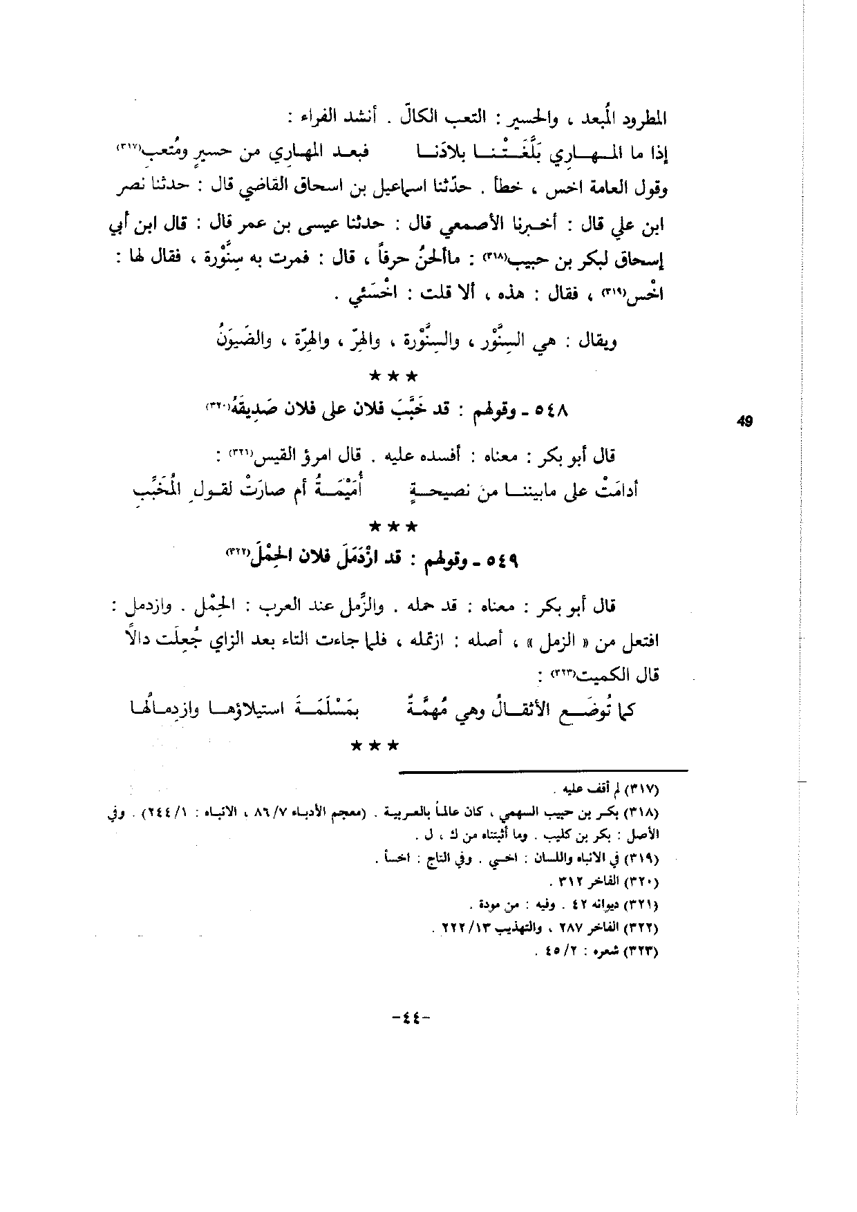 (318) بكر بن حبيب السهمي، كان عالماً بالعربية. (معجم الأدباء 86 / 7، الانباه: 244 / 1) . وفي الأصل: بكر بن كليب. وما أثبتناه من ك، ل.