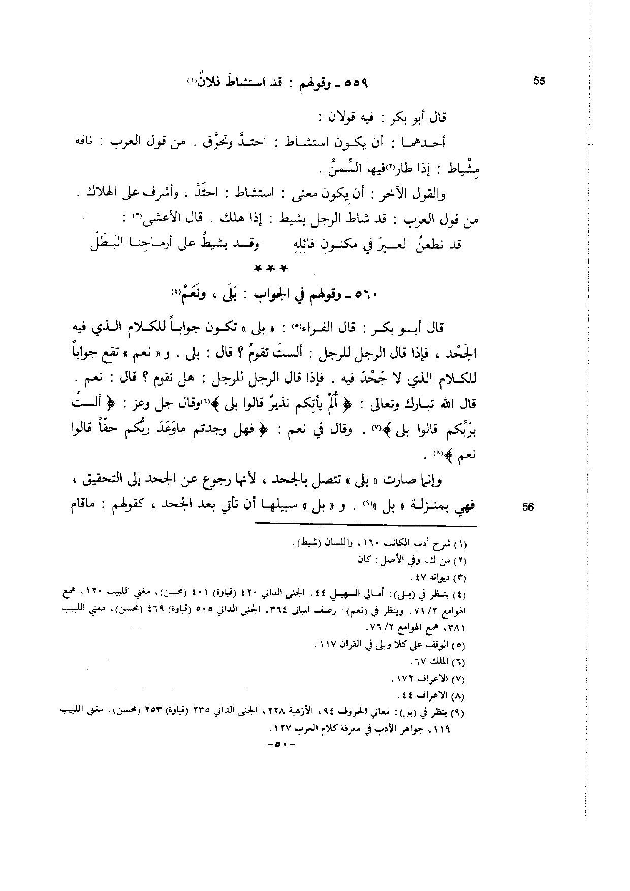 (4) ينظر في (بلى) : أمالي السهيلي 44، الجنى الداني 420 (قباوة) 40 (محسن) ، مغني اللبيب 120، همع الهوامع 71 / 2. وينظر في (نعم) : رصف المباني 364، الجنى الداني 505 (قباوة) 469 (محسن) ، مغني اللبيب 381، همع الهوامع 76 / 2.