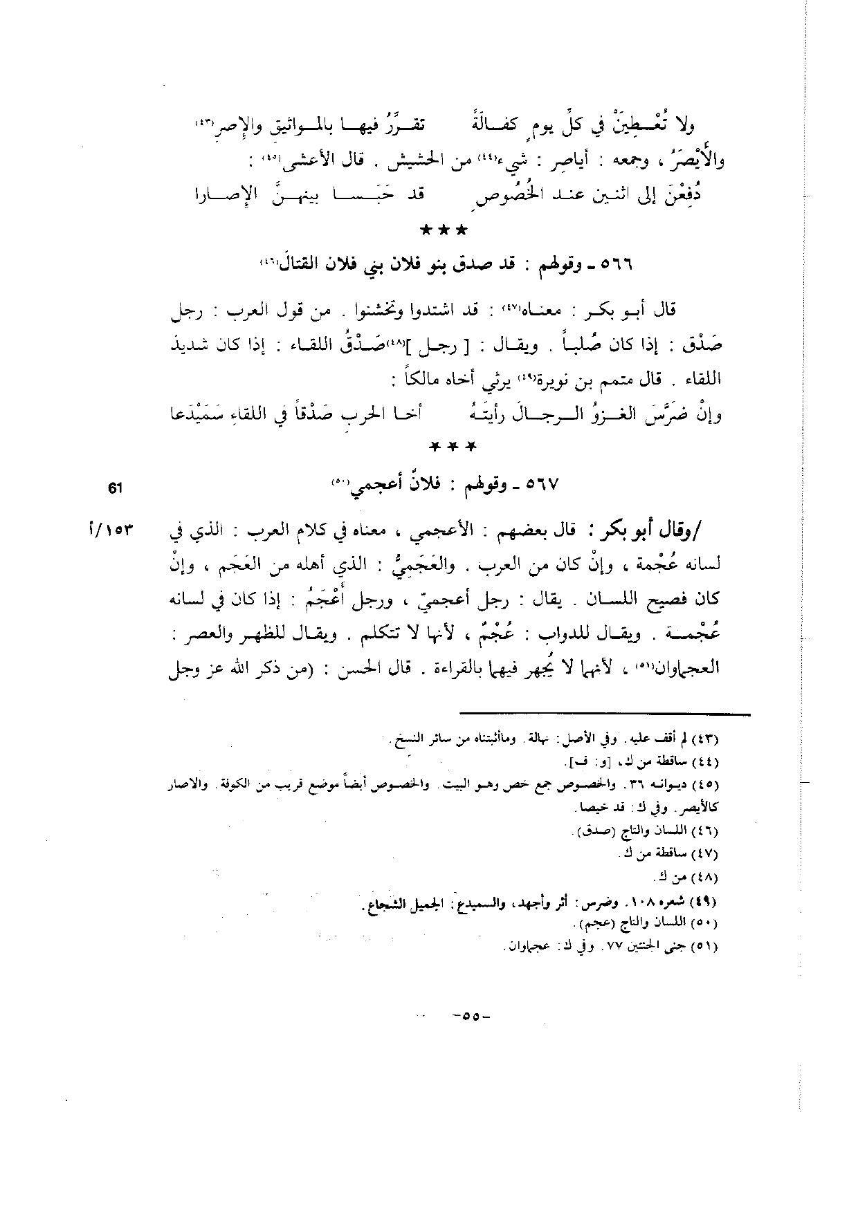 / وقال أبو بكر: قال بعضهم: الأعجمي، معناه في كلام العرب: الذي في / 153 / أ / لسانه عُجْمة، وإنْ كان من العرب. والعَجَمِيُّ: الذي أهله من العَجَم، وإنْ كان فصيح اللسان. يقال: رجل أعجميّ، ورجل أَعْجَمُ: إذا كان في لسانه عُجْمة. ويقال للدواب. عُجْمٌ، لأنها لا تتكلم. ويقال للظهر والعصر: العجماوان (51) ، لأنهما لا يُجهر فيهما بالقراءة. قال الحسن: (من ذكر الله عز وجل
