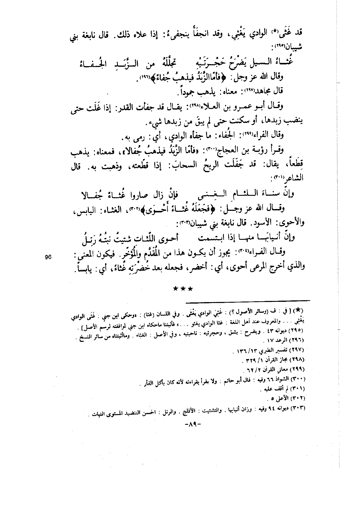 وقال الفراء (299) : الجُفاء: ما جفأه الوادي، أي: رمى به.