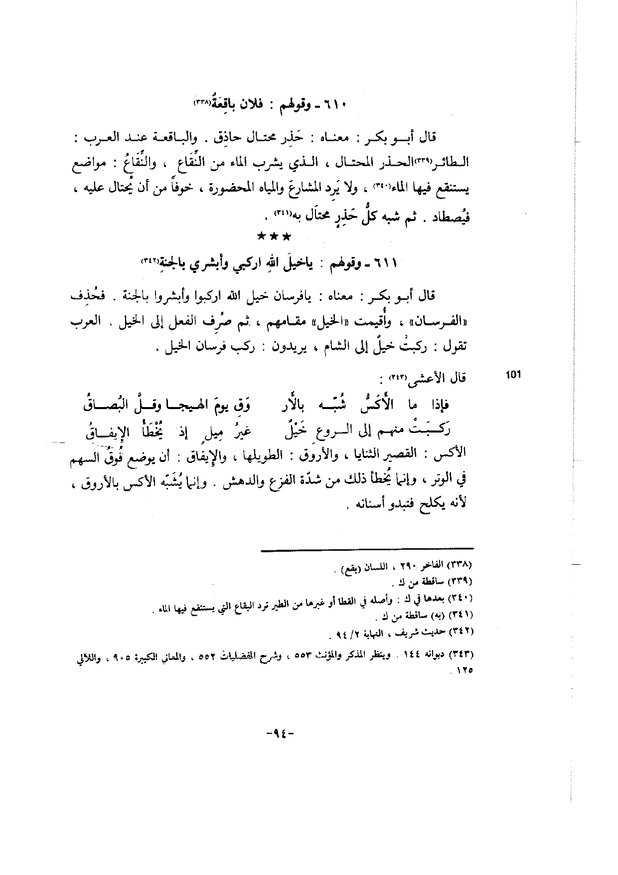 قال أبو بكر: معناه: يا فرسان خيل الله اركبوا وأبشروا بالجنة. فحُذِف " الفرسان "، وأُقيمت " الخيل " مقامهم، ثم صُرِف الفعل إلى الخيل. العرب تقول: ركبتْ خيلٌ إلى الشام، يريدون: ركب فرسان الخيل. (101)