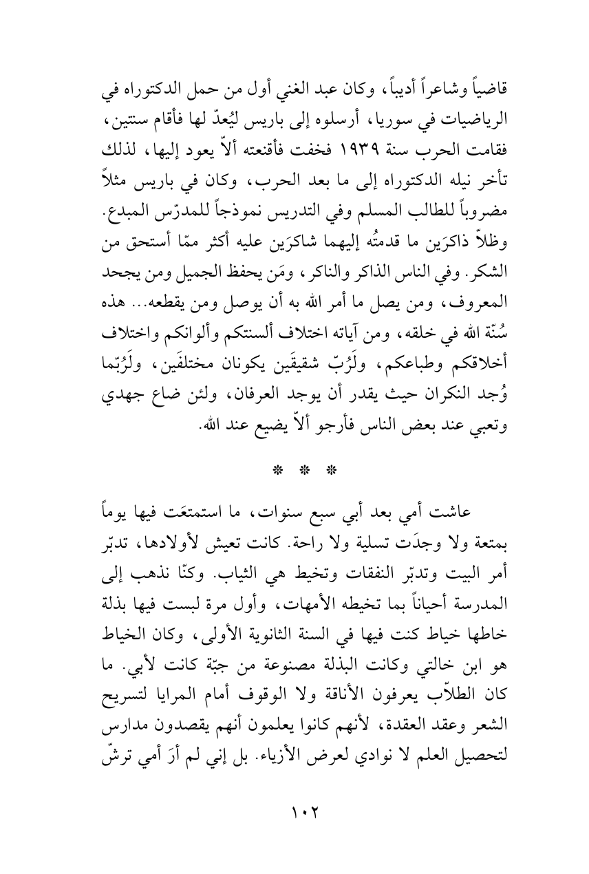 قاضياً وشاعراً أديباً، وكان عبد الغني أول من حمل الدكتوراه في الرياضيات في سوريا، أرسلوه إلى باريس ليُعدّ لها فأقام سنتين، فقامت الحرب سنة 1939 فخفت فأقنعته ألاّ يعود إليها، لذلك تأخر نيله الدكتوراه إلى ما بعد الحرب، وكان في باريس مثلاً مضروباً للطالب المسلم وفي التدريس نموذجاً للمدرّس المبدع. وظلاّ ذاكرَين ما قدمتُه إليهما شاكرَين عليه أكثر ممّا أستحق من الشكر. وفي الناس الذاكر والناكر، ومَن يحفظ الجميل ومن يجحد المعروف، ومن يصل ما أمر الله به أن يوصل ومن يقطعه ... هذه سُنّة الله في خلقه، ومن آياته اختلاف ألسنتكم وألوانكم واختلاف أخلاقكم وطباعكم، ولَرُبّ شقيقَين يكونان مختلفَين، ولَرُبّما وُجد النكران حيث يقدر أن يوجد العرفان، ولئن ضاع جهدي وتعبي عند بعض الناس فأرجو ألاّ يضيع عند الله.