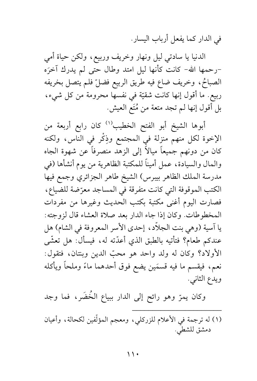 الدنيا يا سادتي ليل ونهار وخريف وربيع، ولكن حياة أمي -رحمها الله- كانت كأنها ليل امتد وطال حتى لم يدرك آخرَه الصباحُ، وخريف ضاع فيه طريق الربيع فضلّ فلم يتصل بخريفه ربيع. ما أقول إنها كانت شقيّة في نفسها محرومة من كل شيء، بل أقول إنها لم تجد متعة من مُتَع العيش.