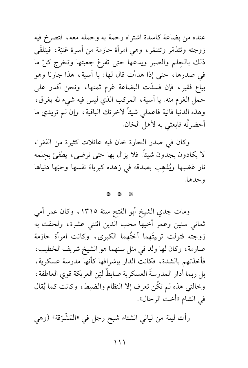 وكان في صدر الحارة خان فيه عائلات كثيرة من الفقراء لا يكادون يجدون شيئاً. فلا يزال بها حتى ترضى، يطفئ بحِلمه نار غضبها ويُذهِب بصدقه في زهده كبرياءَ نفسها وحبّها دنياها وحدها.