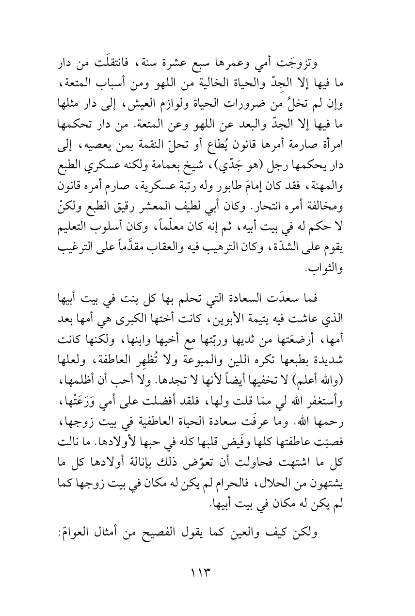فما سعدَت السعادة التي تحلم بها كل بنت في بيت أبيها الذي عاشت فيه يتيمة الأبوين، كانت أختها الكبرى هي أمها بعد أمها، أرضعَتها من ثديها وربّتها مع أخيها وابنها، ولكنها كانت شديدة بطبعها تكره اللين والميوعة ولا تُظهِر العاطفة، ولعلها (والله أعلم) لا تخفيها أيضاً لأنها لا تجدها. ولا أحب أن أظلمها، وأستغفر الله لي ممّا قلت ولها، فلقد أفضلت على أمي وَرَعَتْها، رحمها الله. وما عرفَت سعادة الحياة العاطفية في بيت زوجها، فصبّت عاطفتها كلها وفَيض قلبها كله في حبها لأولادها. ما نالت كل ما اشتهت فحاولت أن تعوّض ذلك بإنالة أولادها كل ما يشتهون من الحلال، فالحرام لم يكن له مكان في بيت زوجها كما لم يكن له مكان في بيت أبيها.