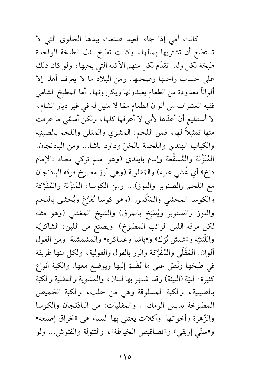 كانت أمي إذا جاء العيد صنعت بيدها الحلوى التي لا تستطيع أن تشتريها بمالها، وكانت تطبخ بدل الطبخة الواحدة طبخة لكل ولد. تقدّم لكل منهم الأكلة التي يحبها، ولو كان ذلك على حساب راحتها وصحتها. ومن البلاد ما لا يعرف أهله إلا ألواناً معدودة من الطعام يعيدونها ويكررونها، أما المطبخ الشامي ففيه العشرات من ألوان الطعام ممّا لا مثيل له في غير ديار الشام، لا أستطيع أن أعدّها لأني لا أعرفها كلها، ولكن أسمّي ما عرفت منها تمثيلاً لها، فمن اللحم: المشوي والمقلي واللحم بالصينية والكباب الهندي واللحمة بالخلّ وداود باشا ... ومن الباذنجان: المُنَزَّلة والمُسقَّعة وإمام بايلدي (وهو اسم تركي معناه «الإمام داخ» أي غُشي عليه) والمَقلوبة (وهي أرز مطبوخ فوقه الباذنجان مع اللحم والصنوبر واللوز) ... ومن الكوسا: المُنزَّلة والمُفَرَّكة والكوسا المحشي والمَكْمور (وهو كوسا يُفرَّغ ويُحشى باللحم واللوز والصنوبر ويُطبَخ بالمرق) والشيخ المغشي (وهو مثله لكن مرقه اللبن الرائب المطبوخ). ويصنع من اللبن: الشاكريّة واللّبَنيّة و «شيش بُرَك» و «باشا وعساكره» والمشمشية. ومن الفول ألوان: المُقَلّى والمُفَرَّكة والرز بالفول والفولية، ولكل منها طريقة في طبخها ونَصّ على ما يُضَمّ إليها ويوضع معها. والكبة أنواع كثيرة: النيّة (النيئة) وقد اشتهر بها لبنان، والمشوية والمقلية والكبّة بالصينية، والكبة المسلوقة وهي من حلب، والكبة الحَميص المطبوخة بدبس الرمان ... والمقليات: من الباذنجان والكوسا والزّهرة وأخواتها. وأكلات يعتني بها النساء هي «حَرّاق إصبعه» و «ستّي إزبقي» و «قصاقيص الخياطة»، والتبّولة والفتوش ... ولو