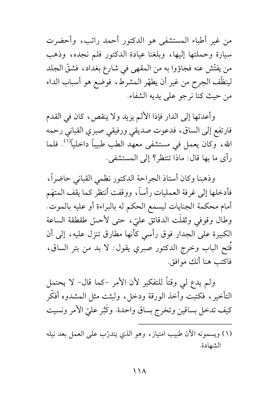 وذهبنا وكان أستاذ الجراحة الدكتور نظمي القباني حاضراً، فأدخلها إلى غرفة العمليات رأساً، ووقفت أنتظر كما يقف المتهَم أمام محكمة الجنايات ليسمع الحكم له بالبراءة أو عليه بالموت. وطال وقوفي وثقلَت الدقائق عليّ، حتى لأحسّ طقطقة الساعة الكبيرة على الجدار فوق رأسي كأنها مطارق تنزل عليه، إلى أن فُتح الباب وخرج الدكتور صبري يقول: لا بد من بتر الساق، فاكتب هنا أنك موافق.