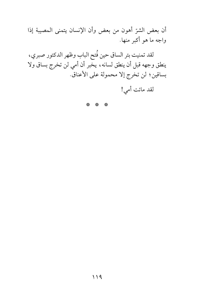 لقد تمنيت بتر الساق حين فُتح الباب وظهر الدكتور صبري، ينطق وجهه قبل أن ينطق لسانه، يخبر أن أمي لن تخرج بساق ولا بساقين؛ لن تخرج إلا محمولة على الأعناق.