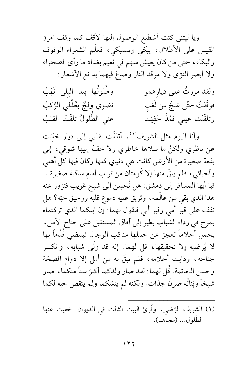 (¬1) الشريف الرّضي، وقُرئ البيت الثالث في الديوان: خفيت عنها الطّلول ... (مجاهد).