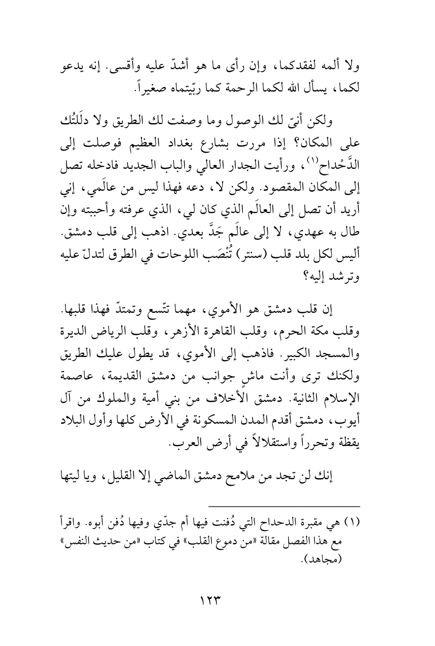 إن قلب دمشق هو الأموي، مهما تتّسع وتمتدّ فهذا قلبها. وقلب مكة الحرم، وقلب القاهرة الأزهر، وقلب الرياض الديرة والمسجد الكبير. فاذهب إلى الأموي، قد يطول عليك الطريق ولكنك ترى وأنت ماشٍ جوانب من دمشق القديمة، عاصمة الإسلام الثانية. دمشق الأخلاف من بني أمية والملوك من آل أيوب، دمشق أقدم المدن المسكونة في الأرض كلها وأول البلاد يقظة وتحرراً واستقلالاً في أرض العرب.