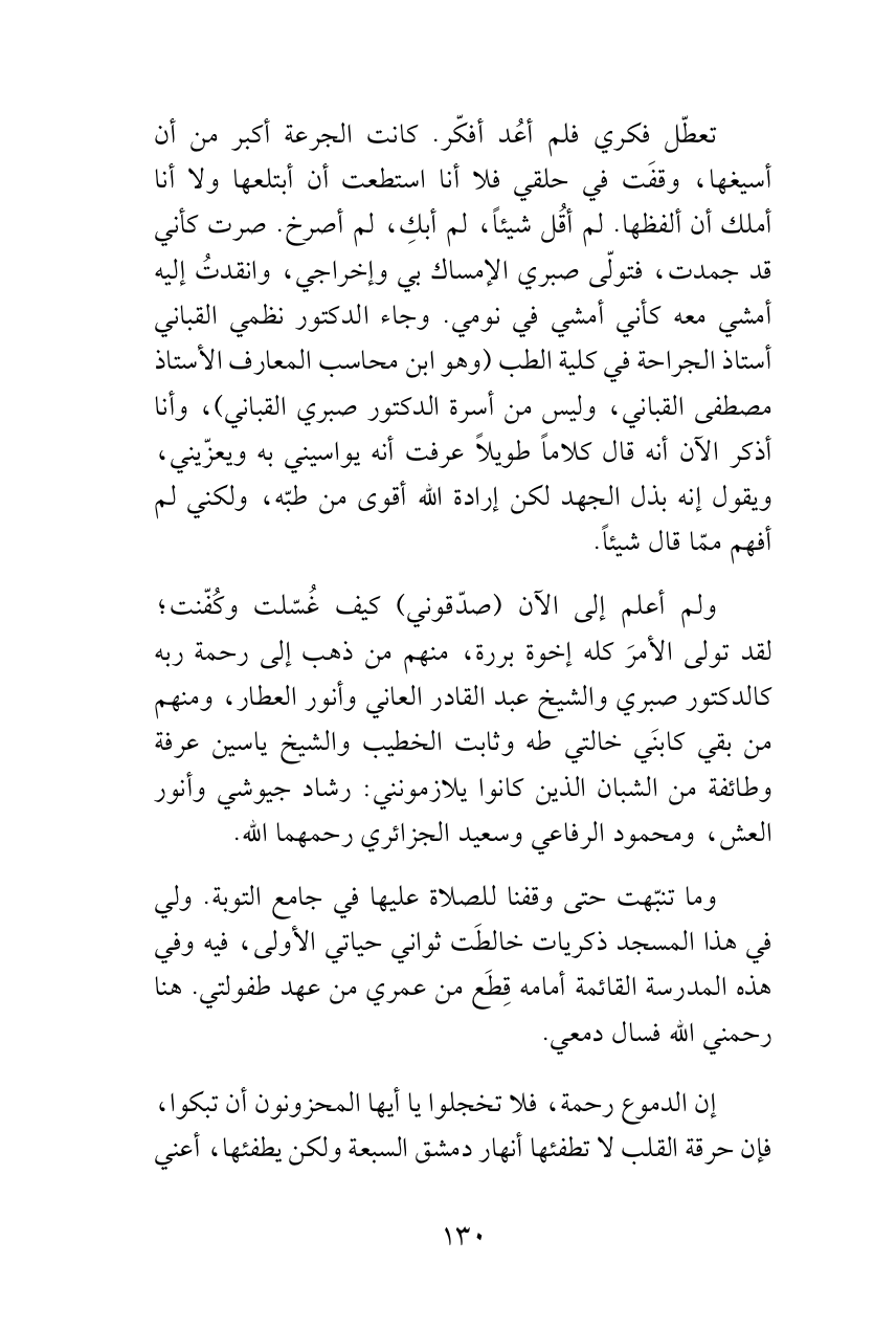 تعطّل فكري فلم أعُد أفكّر. كانت الجرعة أكبر من أن أسيغها، وقفَت في حلقي فلا أنا استطعت أن أبتلعها ولا أنا أملك أن ألفظها. لم أقُل شيئاً، لم أبكِ، لم أصرخ. صرت كأني قد جمدت، فتولّى صبري الإمساك بي وإخراجي، وانقدتُ إليه أمشي معه كأني أمشي في نومي. وجاء الدكتور نظمي القباني أستاذ الجراحة في كلية الطب (وهو ابن محاسب المعارف الأستاذ مصطفى القباني، وليس من أسرة الدكتور صبري القباني)، وأنا أذكر الآن أنه قال كلاماً طويلاً عرفت أنه يواسيني به ويعزّيني، ويقول إنه بذل الجهد لكن إرادة الله أقوى من طبّه، ولكني لم أفهم ممّا قال شيئاً.