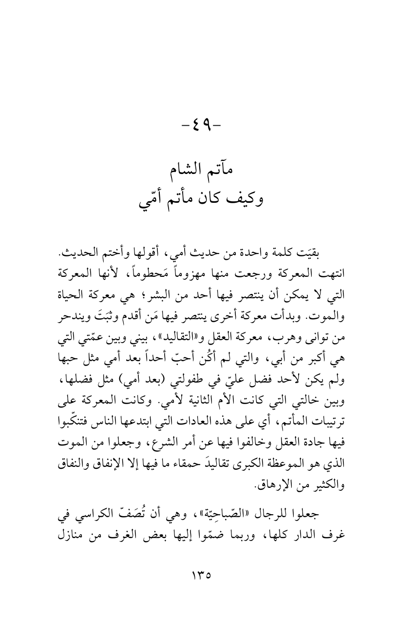 بقيَت كلمة واحدة من حديث أمي، أقولها وأختم الحديث. انتهت المعركة ورجعت منها مهزوماً مَحطوماً، لأنها المعركة التي لا يمكن أن ينتصر فيها أحد من البشر؛ هي معركة الحياة والموت. وبدأت معركة أخرى ينتصر فيها مَن أقدم وثبَتَ ويندحر من توانى وهرب، معركة العقل و «التقاليد»، بيني وبين عمّتي التي هي أكبر من أبي، والتي لم أكُن أحبّ أحداً بعد أمي مثل حبها ولم يكن لأحد فضل عليّ في طفولتي (بعد أمي) مثل فضلها، وبين خالتي التي كانت الأم الثانية لأمي. وكانت المعركة على ترتيبات المأتم، أي على هذه العادات التي ابتدعها الناس فتنكّبوا فيها جادة العقل وخالفوا فيها عن أمر الشرع، وجعلوا من الموت الذي هو الموعظة الكبرى تقاليدَ حمقاء ما فيها إلا الإنفاق والنفاق والكثير من الإرهاق.