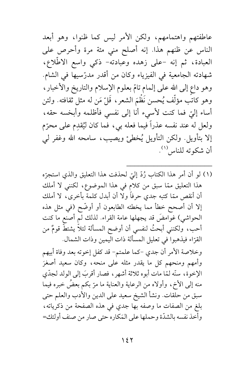 عاطفتهم واهتمامهم، ولكن الأمر ليس كما ظنوا، وهو أبعد الناس عن ظنهم هذا. إنه أصلح مني مئة مرة وأحرص على العبادة، ثم إنه -على زهده وعبادته- ذكي واسع الاطّلاع، شهادته الجامعية في الفيزياء وكان من أقدر مدرّسيها في الشام. وهو داعٍ إلى الله على إلمام تامّ بعلوم الإسلام والتاريخ والأخبار، وهو كاتب مؤلّف يُحسن نَظْمَ الشعر، قَلّ مَن له مثل ثقافته. ولئن أساء إليّ فما كنت لأسيء أنا إلى نفسي فأظلمه وأبخسه حقه، ولعل له عند نفسه عذراً فيما فعله بي، فما كان ليُقدِم على محرّم إلا بتأويل. ولكن التأويل يُخطئ ويصيب، سامحه الله وغفر لي أن شكوته للناس (¬1).