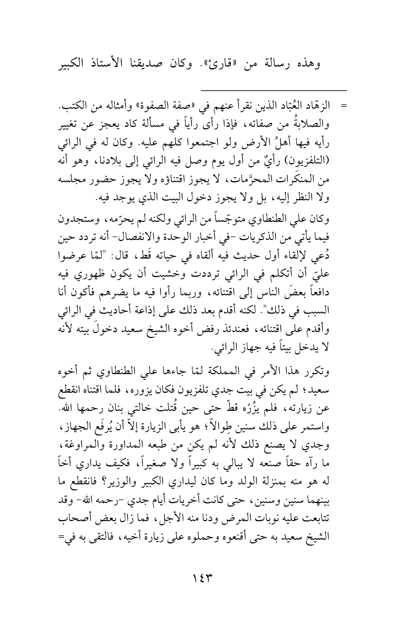 وتكرر هذا الأمر في المملكة لمّا جاءها علي الطنطاوي ثم أخوه سعيد؛ لم يكن في بيت جدي تلفزيون فكان يزوره، فلما اقتناه انقطع عن زيارته، فلم يزُرْه قطّ حتى حين قُتلت خالتي بنان رحمها الله. واستمر على ذلك سنين طِوالاً؛ هو يأبى الزيارة إلاّ أن يُرفَع الجهاز، وجدي لا يصنع ذلك لأنه لم يكن من طبعه المداورة والمراوغة، ما رآه حقاً صنعه لا يبالي به كبيراً ولا صغيراً، فكيف يداري أخاً له هو منه بمنزلة الولد وما كان ليداري الكبير والوزير؟ فانقطع ما بينهما سنين وسنين، حتى كانت أخريات أيام جدي -رحمه الله- وقد تتابعت عليه نوبات المرض ودنا منه الأجل، فما زال بعض أصحاب الشيخ سعيد به حتى أقنعوه وحملوه على زيارة أخيه، فالتقى به في=