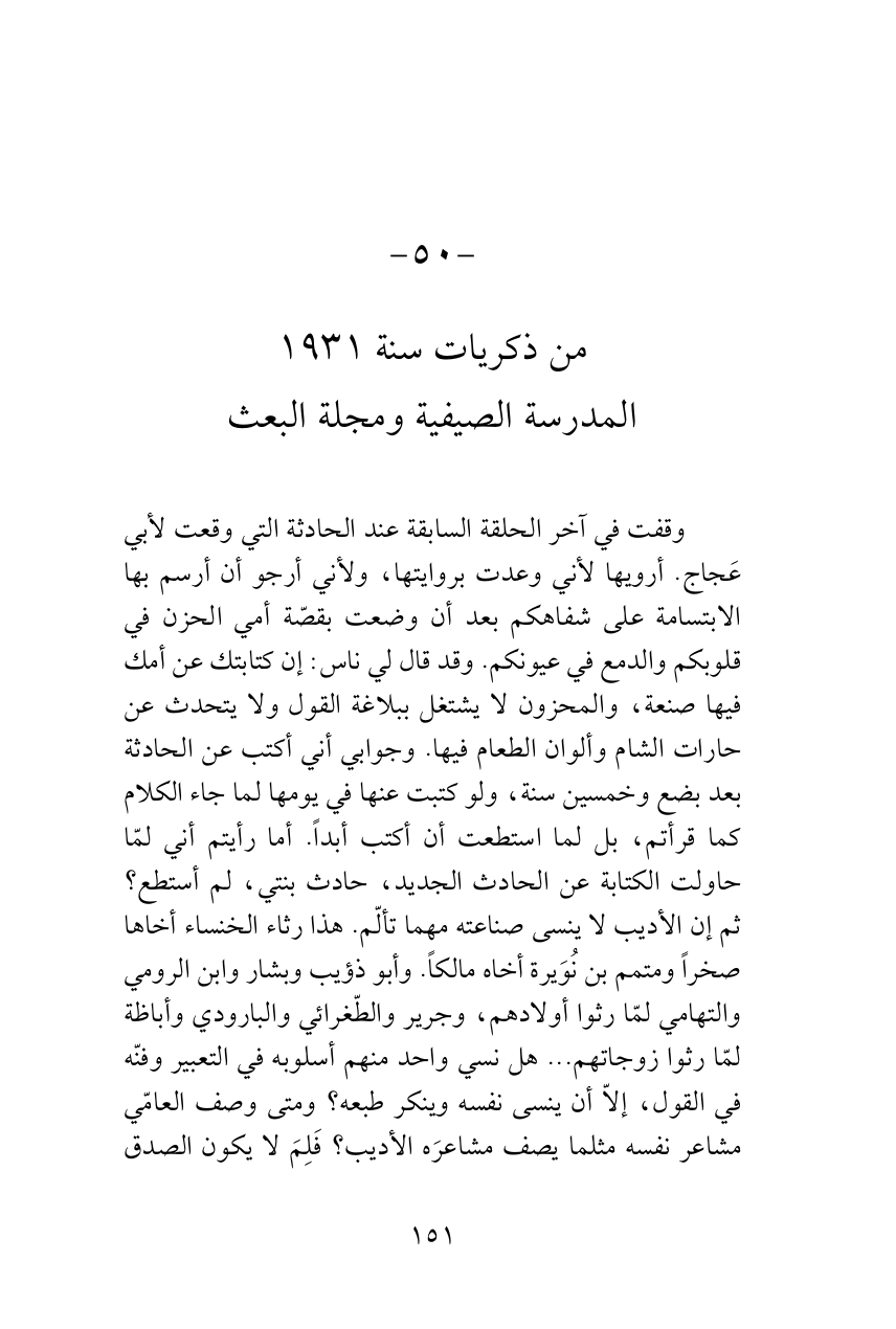 وقفت في آخر الحلقة السابقة عند الحادثة التي وقعت لأبي عَجاج. أرويها لأني وعدت بروايتها، ولأني أرجو أن أرسم بها الابتسامة على شفاهكم بعد أن وضعت بقصّة أمي الحزن في قلوبكم والدمع في عيونكم. وقد قال لي ناس: إن كتابتك عن أمك فيها صنعة، والمحزون لا يشتغل ببلاغة القول ولا يتحدث عن حارات الشام وألوان الطعام فيها. وجوابي أني أكتب عن الحادثة بعد بضع وخمسين سنة، ولو كتبت عنها في يومها لما جاء الكلام كما قرأتم، بل لما استطعت أن أكتب أبداً. أما رأيتم أني لمّا حاولت الكتابة عن الحادث الجديد، حادث بنتي، لم أستطع؟ ثم إن الأديب لا ينسى صناعته مهما تألّم. هذا رثاء الخنساء أخاها صخراً ومتمم بن نُوَيرة أخاه مالكاً. وأبو ذؤيب وبشار وابن الرومي والتهامي لمّا رثوا أولادهم، وجرير والطّغرائي والبارودي وأباظة لمّا رثوا زوجاتهم ... هل نسي واحد منهم أسلوبه في التعبير وفنّه في القول، إلاّ أن ينسى نفسه وينكر طبعه؟ ومتى وصف العامّي مشاعر نفسه مثلما يصف مشاعرَه الأديب؟ فَلِمَ لا يكون الصدق