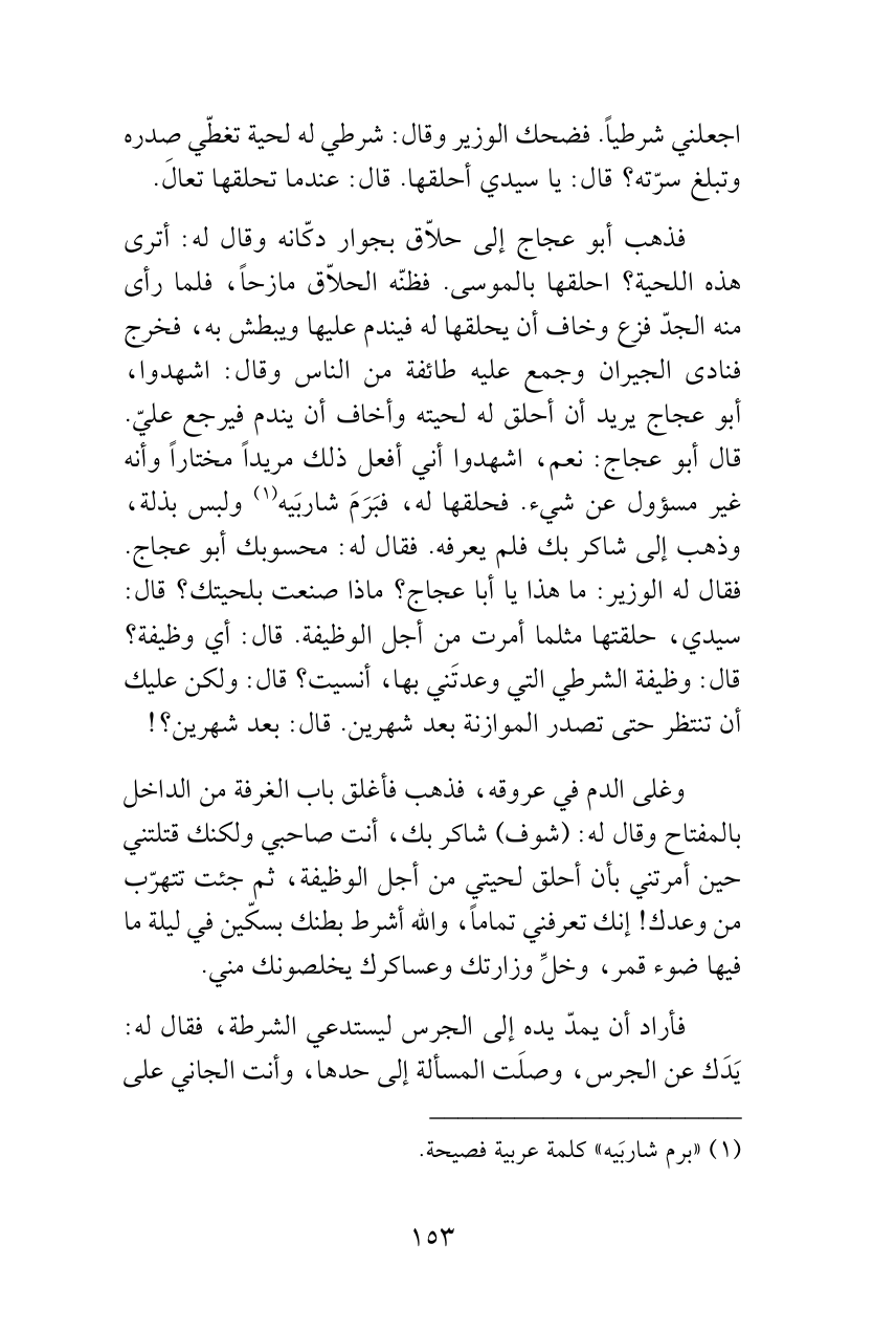 فذهب أبو عجاج إلى حلاّق بجوار دكّانه وقال له: أترى هذه اللحية؟ احلقها بالموسى. فظنّه الحلاّق مازحاً، فلما رأى منه الجدّ فزع وخاف أن يحلقها له فيندم عليها ويبطش به، فخرج فنادى الجيران وجمع عليه طائفة من الناس وقال: اشهدوا، أبوعجاج يريد أن أحلق له لحيته وأخاف أن يندم فيرجع عليّ. قال أبو عجاج: نعم، اشهدوا أني أفعل ذلك مريداً مختاراً وأنه غير مسؤول عن شيء. فحلقها له، فبَرَمَ شاربَيه (¬1) ولبس بذلة، وذهب إلى شاكر بك فلم يعرفه. فقال له: محسوبك أبو عجاج. فقال له الوزير: ما هذا يا أبا عجاج؟ ماذا صنعت بلحيتك؟ قال: سيدي، حلقتها مثلما أمرت من أجل الوظيفة. قال: أي وظيفة؟ قال: وظيفة الشرطي التي وعدتَني بها، أنسيت؟ قال: ولكن عليك أن تنتظر حتى تصدر الموازنة بعد شهرين. قال: بعد شهرين؟!
