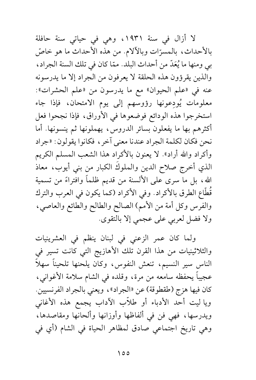 لا أزال في سنة 1931، وهي في حياتي سنة حافلة بالأحداث، بالمسرّات وبالآلام. من هذه الأحداث ما هو خاصّ بي ومنها ما يُعَدّ من أحداث البلد. ممّا كان في تلك السنة الجراد، والذين يقرؤون هذه الحلقة لا يعرفون من الجراد إلا ما يدرسونه عنه في «علم الحيوان» مع ما يدرسون من «علم الحشرات»: معلومات يُودِعونها رؤوسهم إلى يوم الامتحان، فإذا جاء استخرجوا هذه الودائع فوضعوها في الأوراق، فإذا نجحوا فعل أكثرهم بها ما يفعلون بسائر الدروس، يهملونها ثم ينسونها. أما نحن فكان لكلمة الجراد عندنا معنى آخر، فكانوا يقولون: «جراد وأكراد والله أراد». لا يعنون بالأكراد هذا الشعب المسلم الكريم الذي أخرج صلاح الدين والملوكَ الكبار من بني أيوب، معاذ الله، بل ما سرى على الألسنة من قديم ظلماً وافتراءً من تسمية قُطّاع الطرق بالأكراد. وفي الأكراد (كما يكون في العرب والترك والفرس وكل أمة من الأمم) الصالح والطالح والطائع والعاصي، ولا فضل لعربي على عجمي إلا بالتقوى.