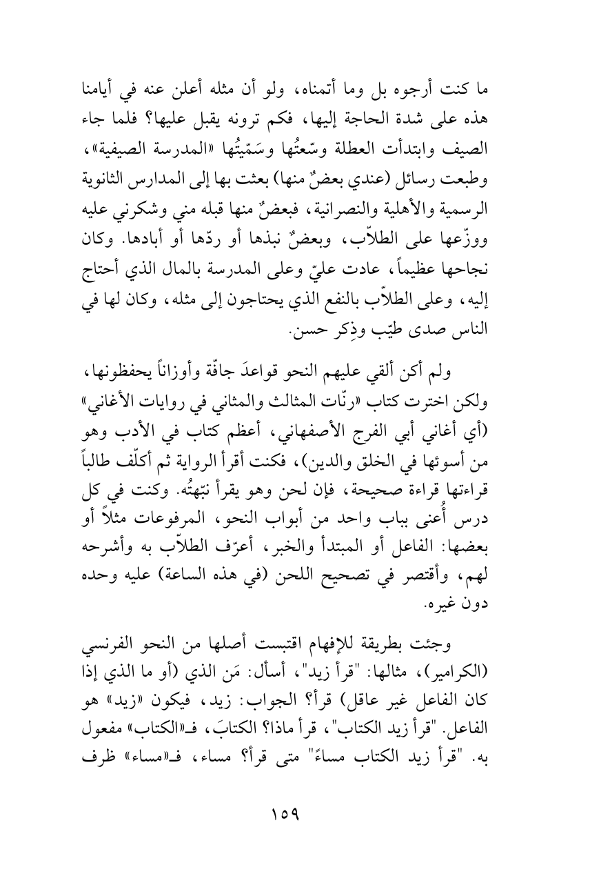 ولم أكن ألقي عليهم النحو قواعدَ جافّة وأوزاناً يحفظونها، ولكن اخترت كتاب «رنّات المثالث والمثاني في روايات الأغاني» (أي أغاني أبي الفرج الأصفهاني، أعظم كتاب في الأدب وهو من أسوئها في الخلق والدين)، فكنت أقرأ الرواية ثم أكلّف طالباً قراءتها قراءة صحيحة، فإن لحن وهو يقرأ نبّهتُه. وكنت في كل درس أُعنى بباب واحد من أبواب النحو، المرفوعات مثلاً أو بعضها: الفاعل أو المبتدأ والخبر، أعرّف الطلاّب به وأشرحه لهم، وأقتصر في تصحيح اللحن (في هذه الساعة) عليه وحده دون غيره.