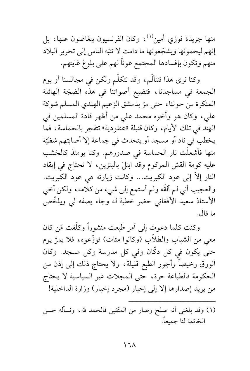 منها جريدة فوزي أمين (¬1)، وكان الفرنسيون يتغاضون عنها، بل إنهم ليحمونها ويشجّعونها ما دامت لا تنبّه الناس إلى تحرير البلاد منهم وتكون بإفسادها المجتمع عوناً لهم على بلوغ غايتهم.