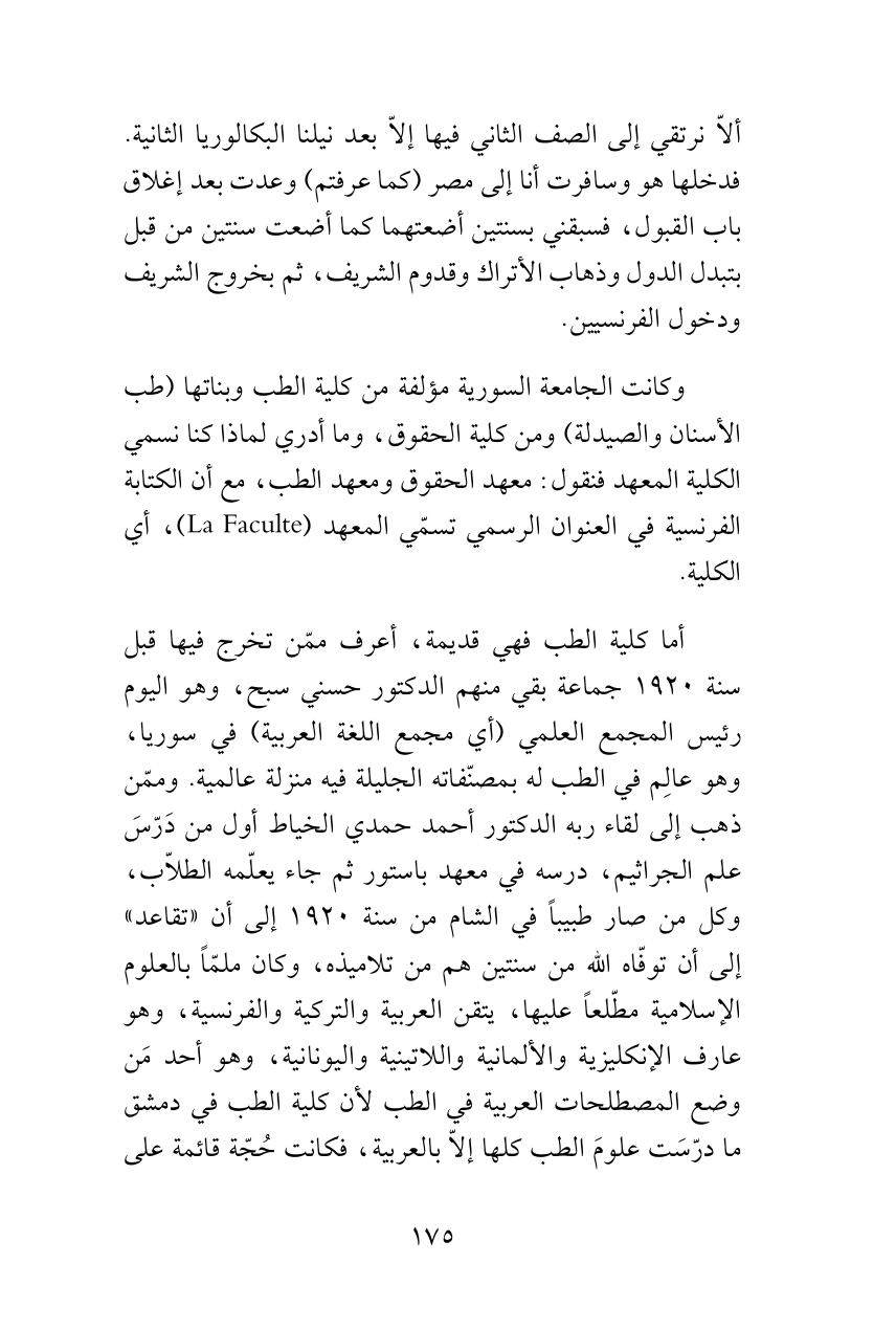 وكانت الجامعة السورية مؤلفة من كلية الطب وبناتها (طب الأسنان والصيدلة) ومن كلية الحقوق، وما أدري لماذا كنا نسمي الكلية المعهد فنقول: معهد الحقوق ومعهد الطب، مع أن الكتابة الفرنسية في العنوان الرسمي تسمّي المعهد (La Faculte)، أي الكلية.