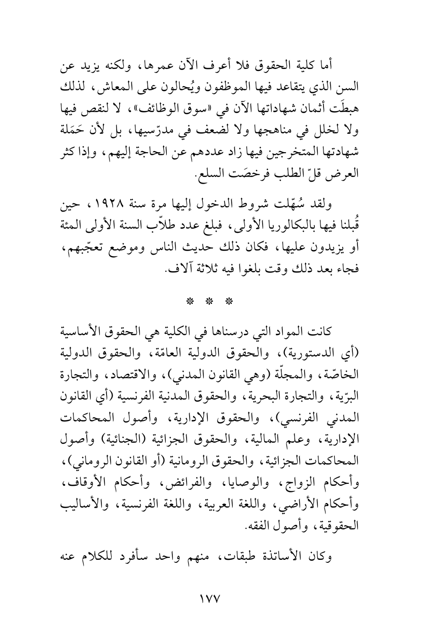 ولقد سُهّلت شروط الدخول إليها مرة سنة 1928، حين قُبلنا فيها بالبكالوريا الأولى، فبلغ عدد طلاّب السنة الأولى المئة أو يزيدون عليها، فكان ذلك حديث الناس وموضع تعجّبهم، فجاء بعد ذلك وقت بلغوا فيه ثلاثة آلاف.
