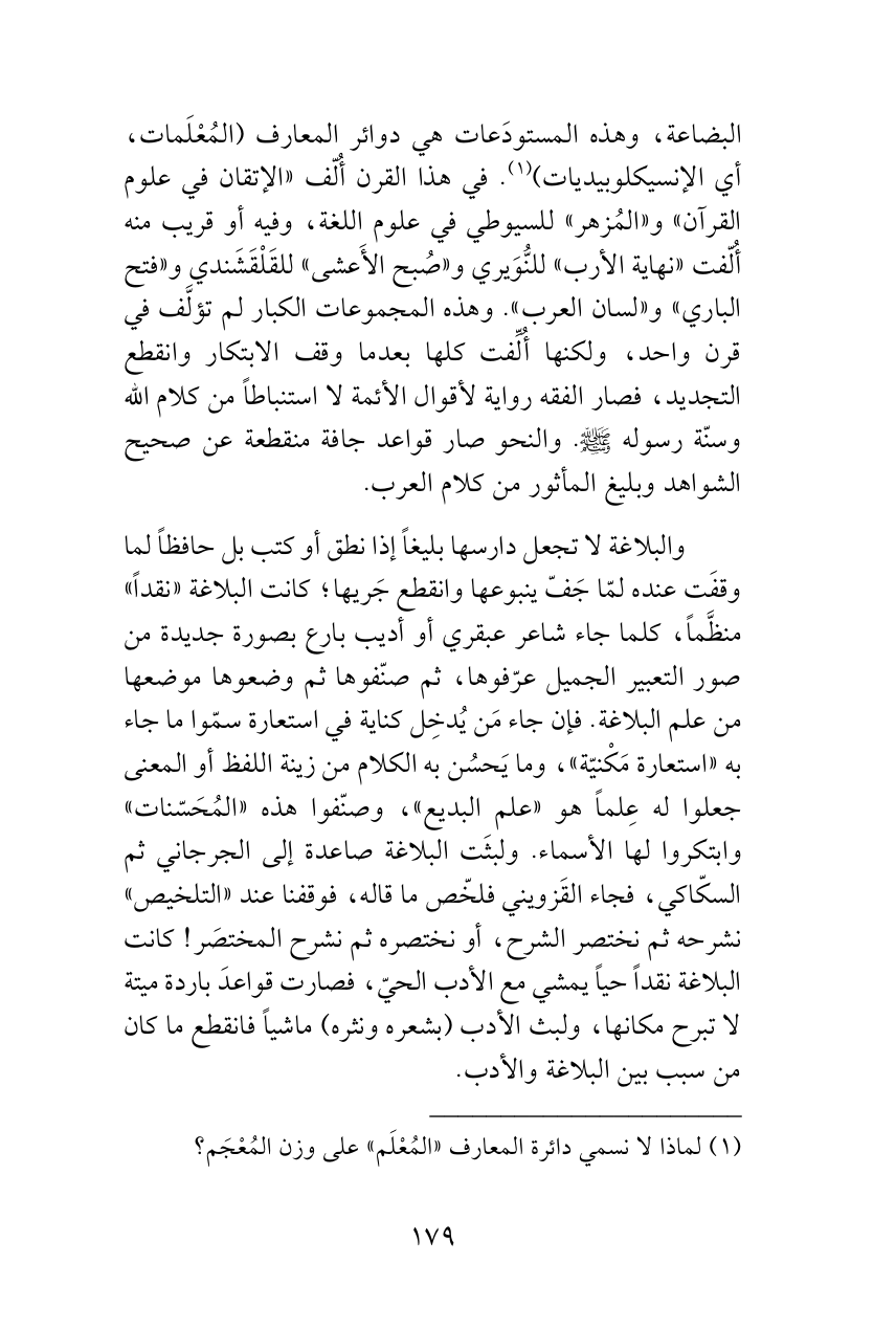 البضاعة، وهذه المستودَعات هي دوائر المعارف (المُعْلَمات، أي الإنسيكلوبيديات) (¬1). في هذا القرن أُلّف «الإتقان في علوم القرآن» و «المُزهر» للسيوطي في علوم اللغة، وفيه أو قريب منه أُلّفت «نهاية الأرب» للنُّوَيري و «صُبح الأَعشى» للقَلْقَشَندي و «فتح الباري» و «لسان العرب». وهذه المجموعات الكبار لم تؤلَّف في قرن واحد، ولكنها أُلِّفت كلها بعدما وقف الابتكار وانقطع التجديد، فصار الفقه رواية لأقوال الأئمة لا استنباطاً من كلام الله وسنّة رسوله ‘. والنحو صار قواعد جافة منقطعة عن صحيح الشواهد وبليغ المأثور من كلام العرب.