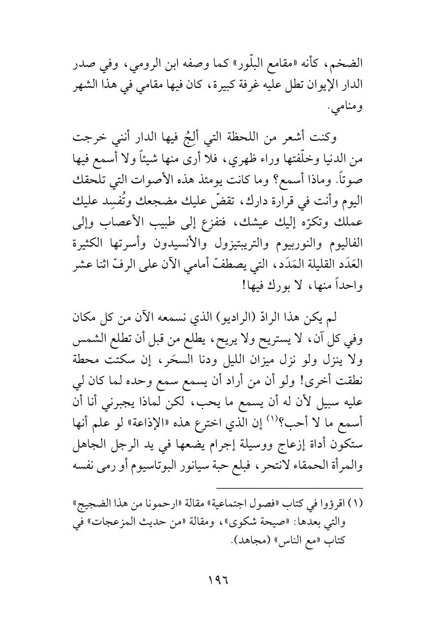 (¬1) اقرؤوا في كتاب «فصول اجتماعية» مقالة «ارحمونا من هذا الضجيج» والتي بعدها: «صيحة شكوى»، ومقالة «من حديث المزعجات» في كتاب «مع الناس» (مجاهد).
