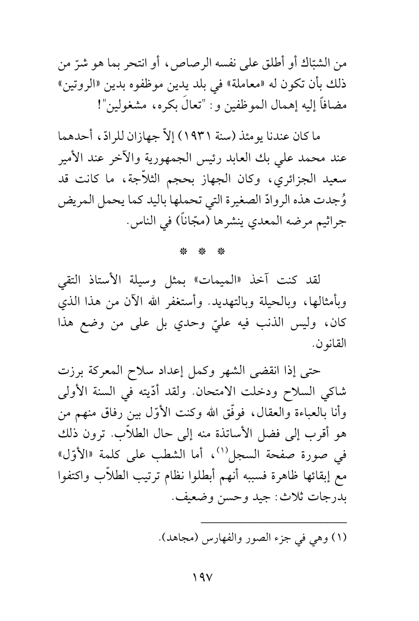ما كان عندنا يومئذ (سنة 1931) إلاّ جهازان للرادّ، أحدهما عند محمد علي بك العابد رئيس الجمهورية والآخر عند الأمير سعيد الجزائري، وكان الجهاز بحجم الثلاّجة، ما كانت قد وُجدت هذه الروادّ الصغيرة التي تحملها باليد كما يحمل المريض جراثيم مرضه المعدي ينشرها (مجّاناً) في الناس.