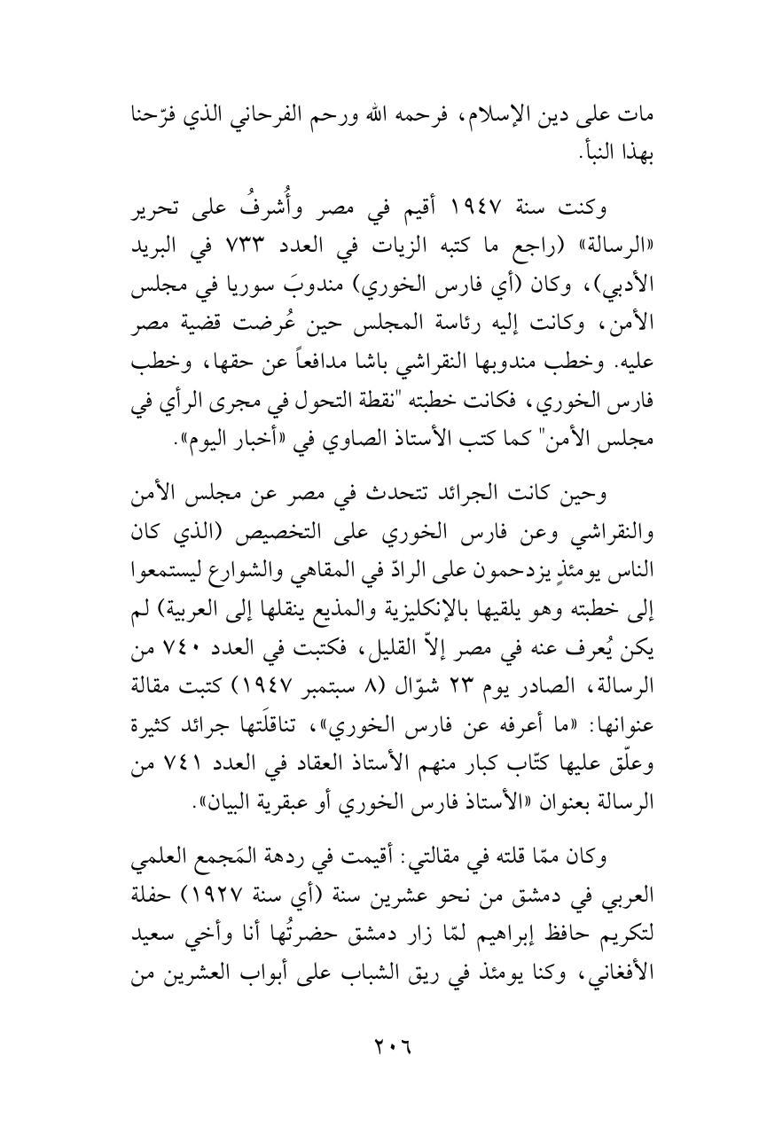 وكنت سنة 1947 أقيم في مصر وأُشرفُ على تحرير «الرسالة» (راجع ما كتبه الزيات في العدد 733 في البريد الأدبي)، وكان (أي فارس الخوري) مندوبَ سوريا في مجلس الأمن، وكانت إليه رئاسة المجلس حين عُرضت قضية مصر عليه. وخطب مندوبها النقراشي باشا مدافعاً عن حقها، وخطب فارس الخوري، فكانت خطبته "نقطة التحول في مجرى الرأي في مجلس الأمن" كما كتب الأستاذ الصاوي في «أخبار اليوم».