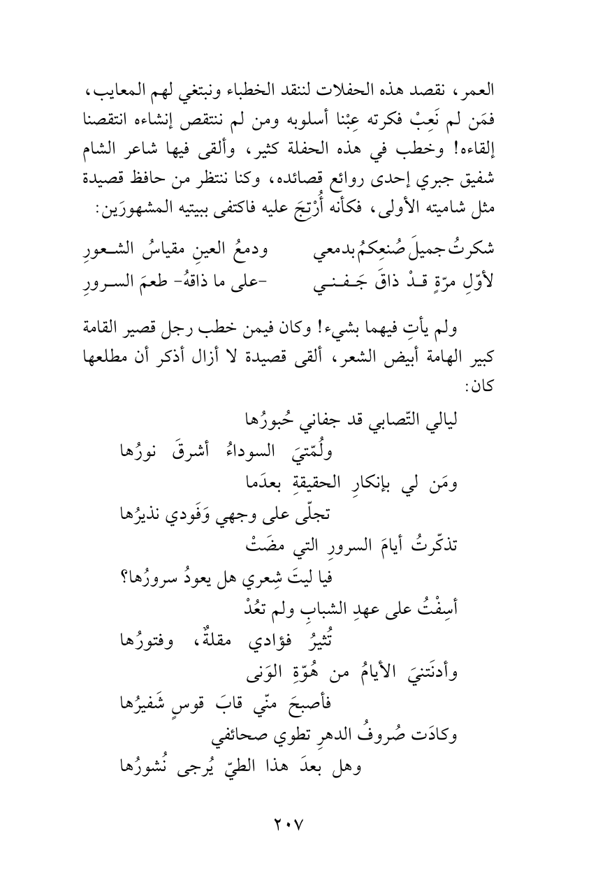 العمر، نقصد هذه الحفلات لننقد الخطباء ونبتغي لهم المعايب، فمَن لم نَعِبْ فكرته عِبْنا أسلوبه ومن لم ننتقص إنشاءه انتقصنا إلقاءه! وخطب في هذه الحفلة كثير، وألقى فيها شاعر الشام شفيق جبري إحدى روائع قصائده، وكنا ننتظر من حافظ قصيدة مثل شاميته الأولى، فكأنه أُرْتِجَ عليه فاكتفى ببيتيه المشهورَين: