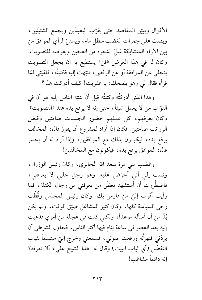 وهذا الذي أدركتُه وكتبتُه قبل أن يتنبّه الناس إليه هو أن في النوّاب من لا يعمل شيئاً، حتى إنه لا يرفع يده عند «التصويت». وكان يعرفهم، كل عملهم حضور الجلسات صامتين وقبض الرواتب صامتين. فكان إذا أراد لمشروع أن يفوز قال: المخالف يرفع يده، فيكونون بذلك مع الموافقين، وإذا أراد له أن يخسر قال: الموافق يرفع يده، فيكونون مع المخالفين!