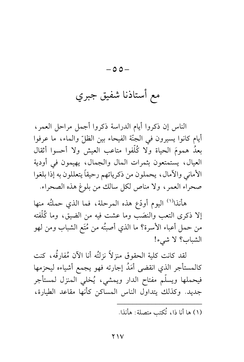 الناس إن ذكروا أيام الدراسة ذكروا أجمل مراحل العمر، أيام كانوا يسيرون في الجنّة الفيحاء بين الظلّ والماء، ما عرفوا بعدُ همومَ الحياة ولا كُلّفوا متاعب العيش ولا أحسوا أثقال العيال، يستمتعون بثمرات المال والجمال، يهيمون في أودية الأماني والآمال، يحملون من ذكرياتهم رحيقاً يتعللون به إذا بلغوا صحراء العمر، ولا مناص لكل سالك من بلوغ هذه الصحراء.