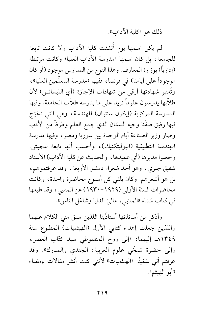 لم يكن اسمها يوم أُنشئت كلية الآداب ولا كانت تابعة للجامعة، بل كان اسمها «مدرسة الآداب العليا» وكانت مرتبطة (إدارياً) بوزارة المعارف. وهذا النوع من المدارس موجود (أو كان موجوداً على أيامنا) في فرنسا، ففيها «مدرسة المعلّمين العليا»، وتُعتبر شهادتها أرقى من شهادات الإجازة (أي الليسانس) لأن طلاّبها يدرسون علوماً تزيد على ما يدرسه طلاّب الجامعة. وفيها المدرسة المركزية (إيكول سنترال) للهندسة، وهي التي تخرّج فيها رفيق صفّنا وجيه السمّان الذي جمع العلم وطرفاً من الأدب وصار وزير الصناعة أيام الوحدة بين سوريا ومصر، وفيها مدرسة الهندسة التطبيقية (البوليتكنيك)، وأحسب أنها تابعة للجيش. وجعلوا مديرها (أي عميدها، والحديث عن كلية الآداب) الأستاذ شفيق جبري، وهو أحد شعراء دمشق الأربعة، وقد عرفتموهم، بل هو أشعرهم. وكان يلقي كل أسبوع محاضرة واحدة، وكانت محاضرات السنة الأولى (1929 - 1930) عن المتنبي، وقد طبعها في كتاب سَمّاه «المتنبي، مالئ الدنيا وشاغل الناس».