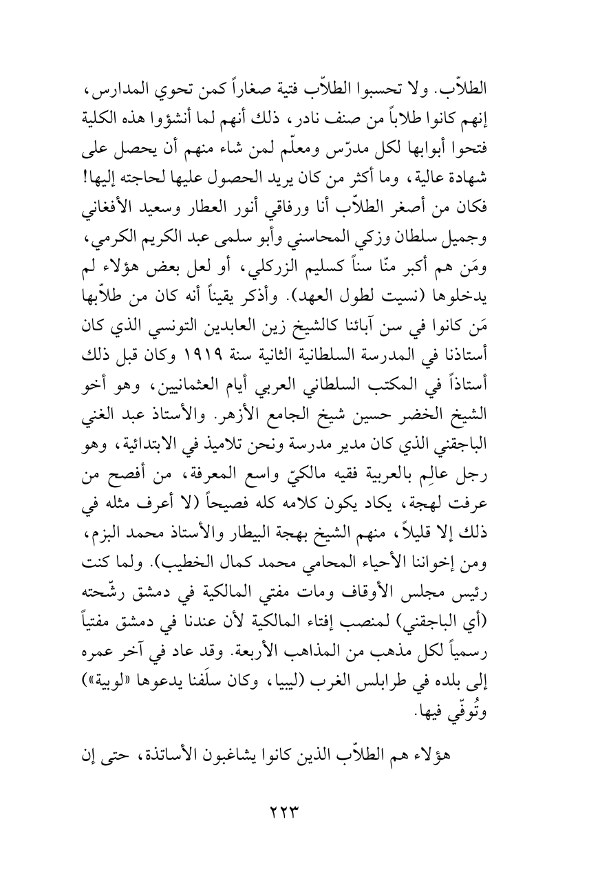 الطلاّب. ولا تحسبوا الطلاّب فتية صغاراً كمن تحوي المدارس، إنهم كانوا طلاباً من صنف نادر، ذلك أنهم لما أنشؤوا هذه الكلية فتحوا أبوابها لكل مدرّس ومعلّم لمن شاء منهم أن يحصل على شهادة عالية، وما أكثر من كان يريد الحصول عليها لحاجته إليها! فكان من أصغر الطلاّب أنا ورفاقي أنور العطار وسعيد الأفغاني وجميل سلطان وزكي المحاسني وأبو سلمى عبد الكريم الكرمي، ومَن هم أكبر منّا سناً كسليم الزركلي، أو لعل بعض هؤلاء لم يدخلوها (نسيت لطول العهد). وأذكر يقيناً أنه كان من طلاّبها مَن كانوا في سن آبائنا كالشيخ زين العابدين التونسي الذي كان أستاذنا في المدرسة السلطانية الثانية سنة 1919 وكان قبل ذلك أستاذاً في المكتب السلطاني العربي أيام العثمانيين، وهو أخو الشيخ الخضر حسين شيخ الجامع الأزهر. والأستاذ عبد الغني الباجقني الذي كان مدير مدرسة ونحن تلاميذ في الابتدائية، وهو رجل عالِم بالعربية فقيه مالكيّ واسع المعرفة، من أفصح من عرفت لهجة، يكاد يكون كلامه كله فصيحاً (لا أعرف مثله في ذلك إلا قليلاً، منهم الشيخ بهجة البيطار والأستاذ محمد البزم، ومن إخواننا الأحياء المحامي محمد كمال الخطيب). ولما كنت رئيس مجلس الأوقاف ومات مفتي المالكية في دمشق رشّحته (أي الباجقني) لمنصب إفتاء المالكية لأن عندنا في دمشق مفتياً رسمياً لكل مذهب من المذاهب الأربعة. وقد عاد في آخر عمره إلى بلده في طرابلس الغرب (ليبيا، وكان سلَفنا يدعوها «لوبية») وتُوفّي فيها.