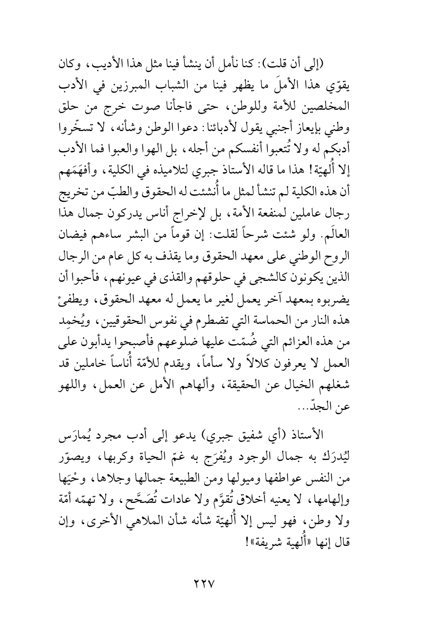 (إلى أن قلت): كنا نأمل أن ينشأ فينا مثل هذا الأديب، وكان يقوّي هذا الأملَ ما يظهر فينا من الشباب المبرزين في الأدب المخلصين للأمة وللوطن، حتى فاجأنا صوت خرج من حلق وطني بإيعاز أجنبي يقول لأدبائنا: دعوا الوطن وشأنه، لا تسخّروا أدبكم له ولا تُتعبوا أنفسكم من أجله، بل الهوا والعبوا فما الأدب إلا أُلهيّة! هذا ما قاله الأستاذ جبري لتلاميذه في الكلية، وأفهَمَهم أن هذه الكلية لم تنشأ لمثل ما أُنشئت له الحقوق والطبّ من تخريج رجال عاملين لمنفعة الأمة، بل لإخراج أناس يدركون جمال هذا العالَم. ولو شئت شرحاً لقلت: إن قوماً من البشر ساءهم فيضان الروح الوطني على معهد الحقوق وما يقذف به كل عام من الرجال الذين يكونون كالشجى في حلوقهم والقذى في عيونهم، فأحبوا أن يضربوه بمعهد آخر يعمل لغير ما يعمل له معهد الحقوق، ويطفئ هذه النار من الحماسة التي تضطرم في نفوس الحقوقيين، ويُخمِد من هذه العزائم التي ضُمّت عليها ضلوعهم فأصبحوا يدأبون على العمل لا يعرفون كلالاً ولا سأماً، ويقدم للأمّة أُناساً خاملين قد شغلهم الخيال عن الحقيقة، وألهاهم الأمل عن العمل، واللهو عن الجدّ ...