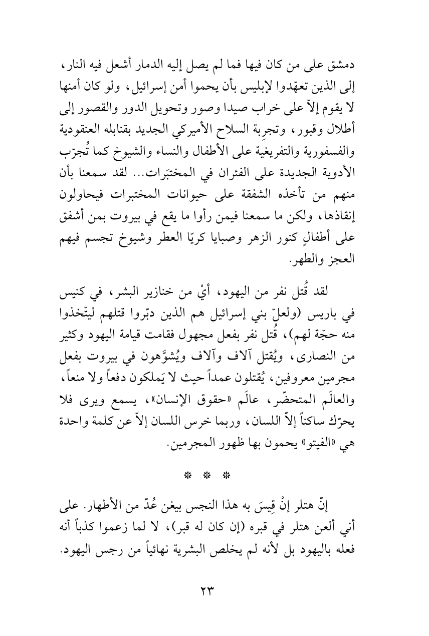 لقد قُتل نفر من اليهود، أيْ من خنازير البشر، في كنيس في باريس (ولعلّ بني إسرائيل هم الذين دبّروا قتلهم ليتّخذوا منه حجّة لهم)، قُتل نفر بفعل مجهول فقامت قيامة اليهود وكثير من النصارى، ويُقتل آلاف وآلاف ويُشوَّهون في بيروت بفعل مجرمين معروفين، يُقتلون عمداً حيث لا يَملكون دفعاً ولا منعاً، والعالَم المتحضّر، عالَم «حقوق الإنسان»، يسمع ويرى فلا يحرّك ساكناً إلاّ اللسان، وربما خرس اللسان إلاّ عن كلمة واحدة هي «الفيتو» يحمون بها ظهور المجرمين.