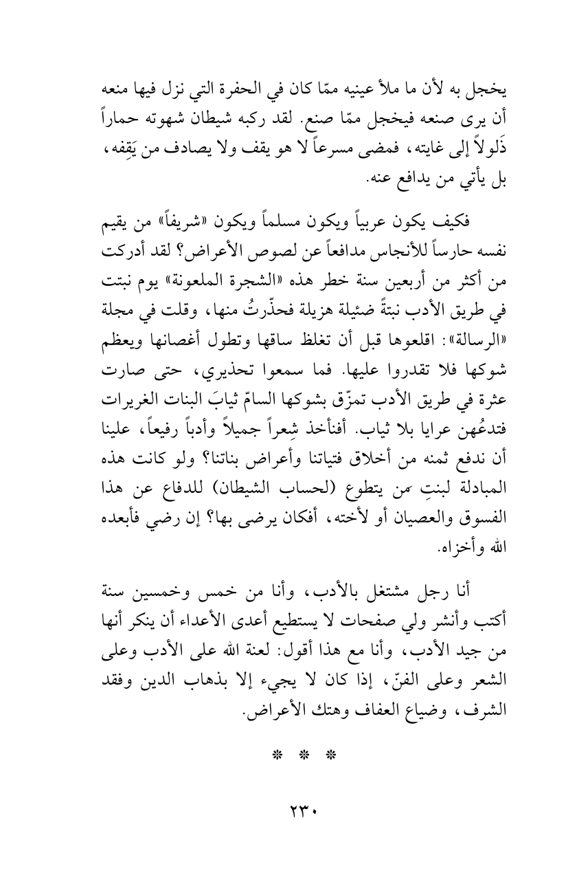 فكيف يكون عربياً ويكون مسلماً ويكون «شريفاً» من يقيم نفسه حارساً للأنجاس مدافعاً عن لصوص الأعراض؟ لقد أدركت من أكثر من أربعين سنة خطر هذه «الشجرة الملعونة» يوم نبتت في طريق الأدب نبتةً ضئيلة هزيلة فحذّرتُ منها، وقلت في مجلة «الرسالة»: اقلعوها قبل أن تغلظ ساقها وتطول أغصانها ويعظم شوكها فلا تقدروا عليها. فما سمعوا تحذيري، حتى صارت عثرة في طريق الأدب تمزّق بشوكها السامّ ثيابَ البنات الغريرات فتدعُهن عرايا بلا ثياب. أفنأخذ شِعراً جميلاً وأدباً رفيعاً، علينا أن ندفع ثمنه من أخلاق فتياتنا وأعراض بناتنا؟ ولو كانت هذه المبادلة لبنتِ مَن يتطوع (لحساب الشيطان) للدفاع عن هذا الفسوق والعصيان أو لأخته، أفكان يرضى بها؟ إن رضي فأبعده الله وأخزاه.