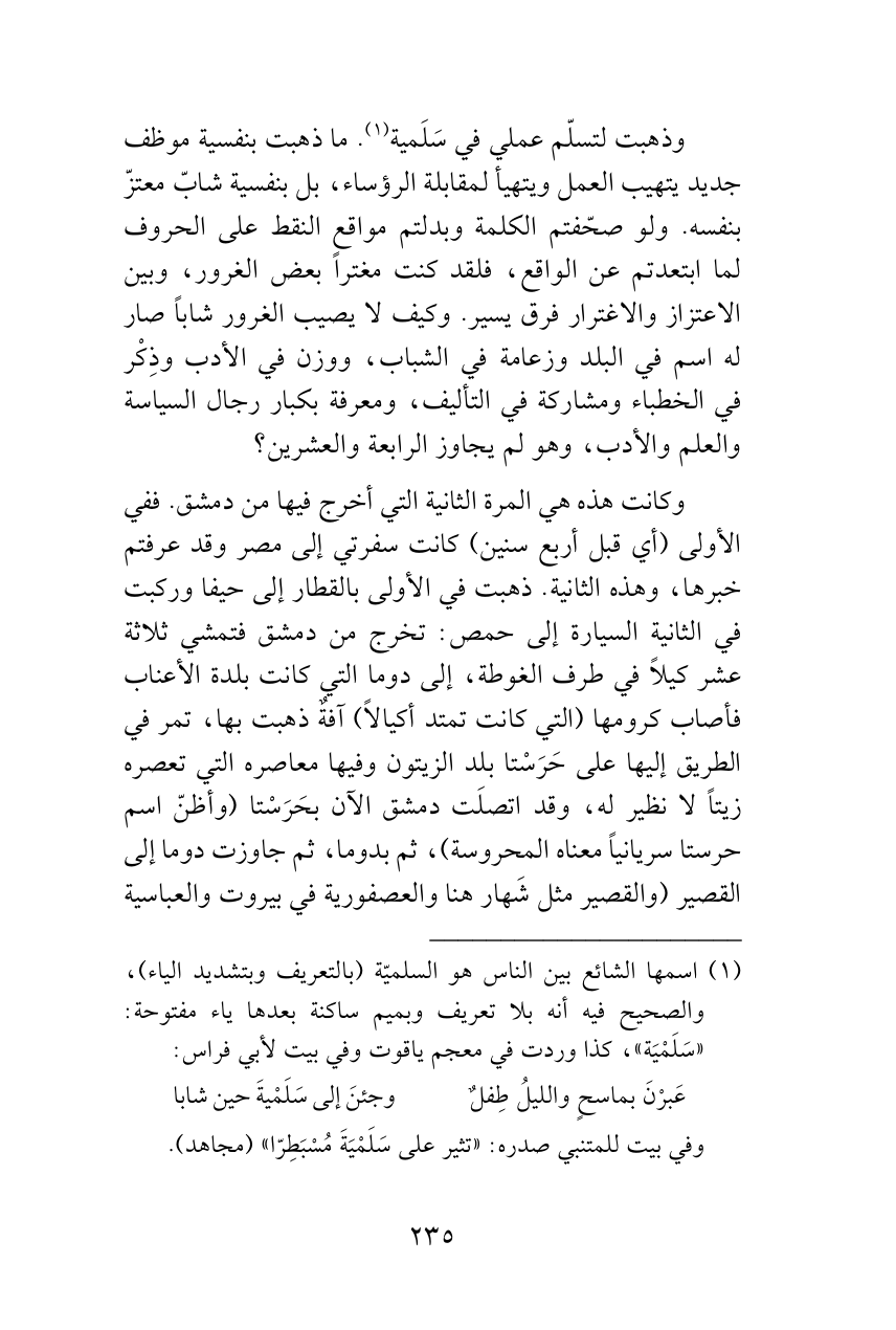 وذهبت لتسلّم عملي في سَلَمية (¬1). ما ذهبت بنفسية موظف جديد يتهيب العمل ويتهيأ لمقابلة الرؤساء، بل بنفسية شابّ معتزّ بنفسه. ولو صحّفتم الكلمة وبدلتم مواقع النقط على الحروف لما ابتعدتم عن الواقع، فلقد كنت مغتراً بعض الغرور، وبين الاعتزاز والاغترار فرق يسير. وكيف لا يصيب الغرور شاباً صار له اسم في البلد وزعامة في الشباب، ووزن في الأدب وذِكْر في الخطباء ومشاركة في التأليف، ومعرفة بكبار رجال السياسة والعلم والأدب، وهو لم يجاوز الرابعة والعشرين؟