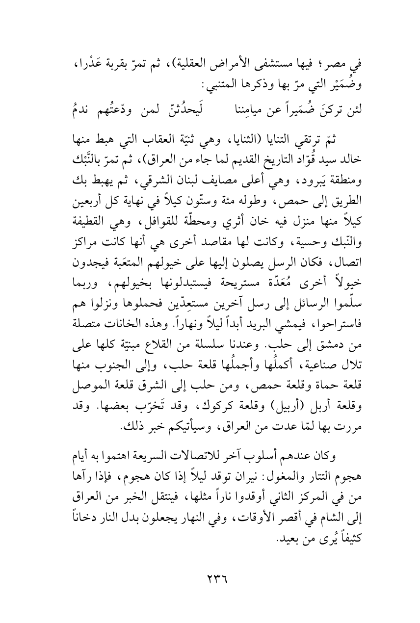 ثمّ ترتقي التنايا (الثنايا، وهي ثنيّة العقاب التي هبط منها خالد سيد قُوّاد التاريخ القديم لما جاء من العراق)، ثم تمرّ بالنَّبْك ومنطقة يَبرود، وهي أعلى مصايف لبنان الشرقي، ثم يهبط بك الطريق إلى حمص، وطوله مئة وستّون كيلاً في نهاية كل أربعين كيلاً منها منزل فيه خان أثري ومحطّة للقوافل، وهي القطيفة والنّبك وحسية، وكانت لها مقاصد أخرى هي أنها كانت مراكز اتصال، فكان الرسل يصلون إليها على خيولهم المتعَبة فيجدون خيولاً أخرى مُعَدّة مستريحة فيستبدلونها بخيولهم، وربما سلّموا الرسائل إلى رسل آخرين مستعِدّين فحملوها ونزلوا هم فاستراحوا، فيمشي البريد أبداً ليلاً ونهاراً. وهذه الخانات متصلة من دمشق إلى حلب. وعندنا سلسلة من القلاع مبنيّة كلها على تلال صناعية، أكملُها وأجملُها قلعة حلب، وإلى الجنوب منها قلعة حماة وقلعة حمص، ومن حلب إلى الشرق قلعة الموصل وقلعة أربل (أربيل) وقلعة كركوك، وقد تَخرّب بعضها. وقد مررت بها لمّا عدت من العراق، وسيأتيكم خبر ذلك.