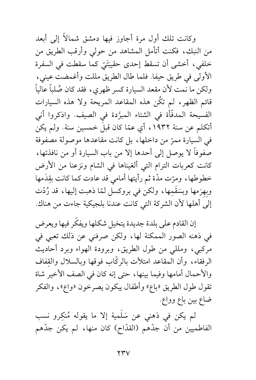 وكانت تلك أول مرة أجاوز فيها دمشق شمالاً إلى أبعد من النبك، فكنت أتأمل المشاهد من حولي وأرقب الطريق من خلفي، أخشى أن تسقط إحدى حقيبَتَيّ كما سقطت في السفرة الأولى في طريق حيفا. فلما طال الطريق مللت وأغمضت عيني، ولكن ما نمت لأن مقعد السيارة كسر ظهري، فقد كان صُلباً عالياً قائم الظهر، لم تكُن هذه المقاعد المريحة ولا هذه السيارات الفسيحة المدفّأة في الشتاء المبرَّدة في الصيف. واذكروا أني أتكلم عن سنة 1932، أي عمّا كان قبلَ خمسين سنة. ولم يكن في السيارة ممرّ من داخلها، بل كانت مقاعدها موصولة مصفوفة صفوفاً لا يوصل إلى أحدها إلا من باب السيارة أو من نافذتها، كانت كعربات الترام التي ألغيناها في الشام ونزعنا من الأرض خطوطها، ومرّت مدّة ثم رأيتها أمامي قد عادت كما كانت بقِدَمها وبِهِرَمها وبسَقَمِها، ولكن في بروكسل لمّا ذهبت إليها، قد رُدّت إلى أهلها لأن الشركة التي كانت عندنا بلجيكية جاءت من هناك.