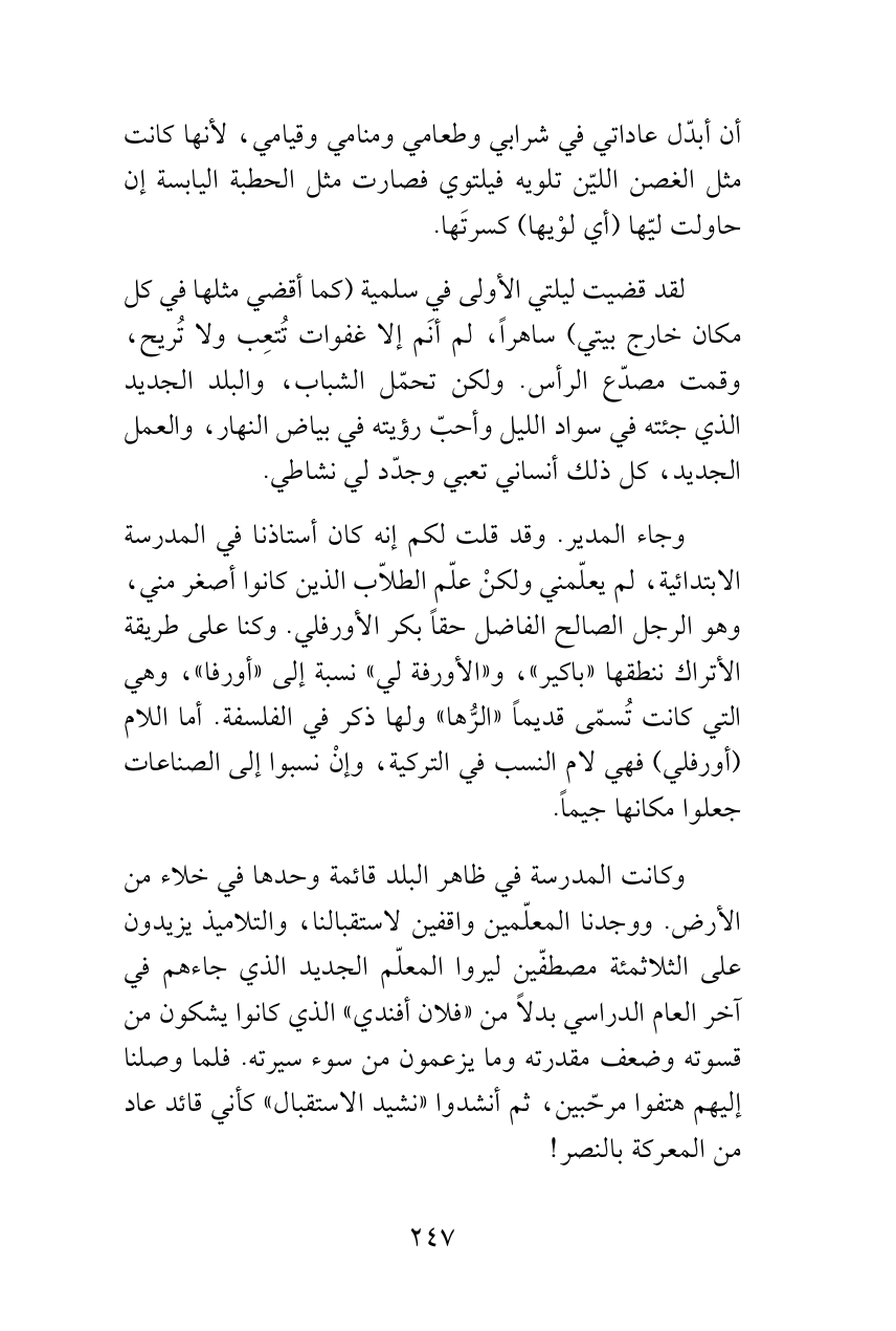 وجاء المدير. وقد قلت لكم إنه كان أستاذنا في المدرسة الابتدائية، لم يعلّمني ولكنْ علّم الطلاّب الذين كانوا أصغر مني، وهو الرجل الصالح الفاضل حقاً بكر الأورفلي. وكنا على طريقة الأتراك ننطقها «باكير»، و «الأورفة لي» نسبة إلى «أورفا»، وهي التي كانت تُسمّى قديماً «الرُّها» ولها ذكر في الفلسفة. أما اللام (أورفلي) فهي لام النسب في التركية، وإنْ نسبوا إلى الصناعات جعلوا مكانها جيماً.