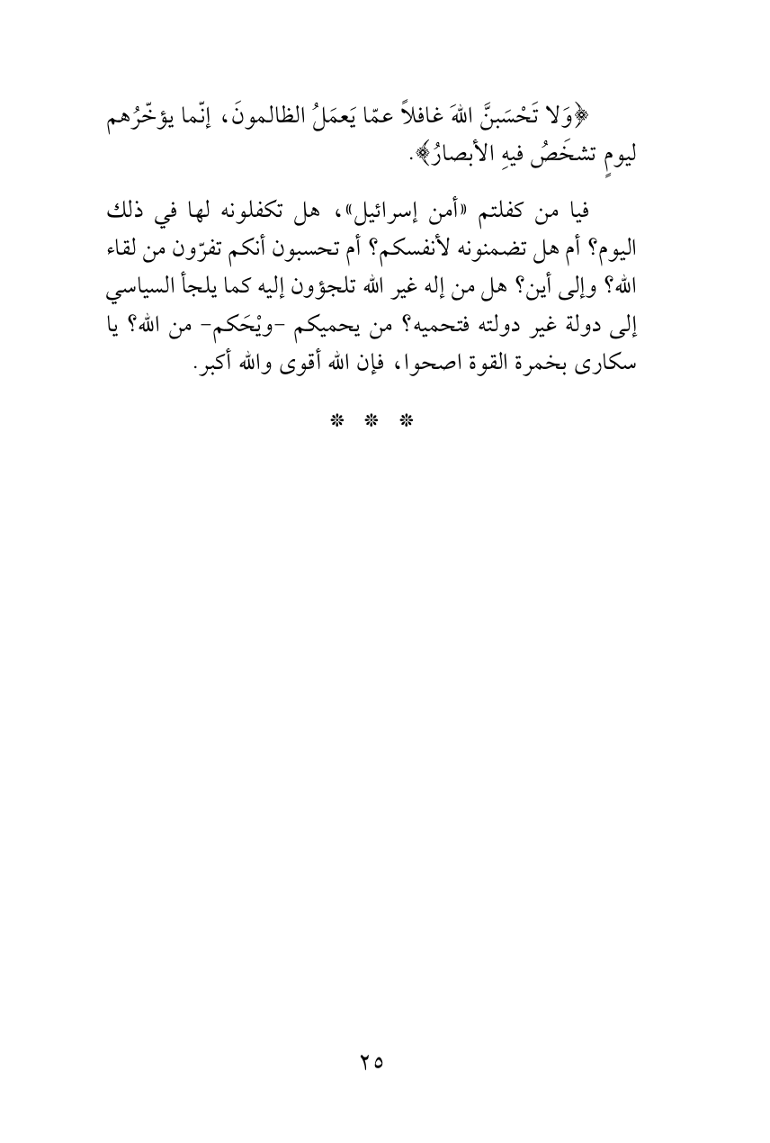 فيا من كفلتم «أمن إسرائيل»، هل تكفلونه لها في ذلك اليوم؟ أم هل تضمنونه لأنفسكم؟ أم تحسبون أنكم تفرّون من لقاء الله؟ وإلى أين؟ هل من إله غير الله تلجؤون إليه كما يلجأ السياسي إلى دولة غير دولته فتحميه؟ من يحميكم -ويْحَكم- من الله؟ يا سكارى بخمرة القوة اصحوا، فإن الله أقوى والله أكبر.