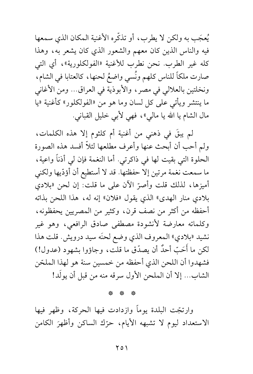 لم يبقَ في ذهني من أغنية أم كلثوم إلا هذه الكلمات، ولم أحب أن أبحث عنها وأعرف مطلعها لئلاّ أفسد هذه الصورة الحلوة التي بقيت لها في ذاكرتي. أما النغمة فإن لي أذناً واعية، ما سمعت نغمة مرتين إلا حفظتها. قد لا أستطيع أن أؤدّيها ولكني أميزها، لذلك قلت وأصرّ الآن على ما قلت: إن لحن «بلادي بلادي منار الهدى» الذي يقول «فلان» إنه له، هذا اللحن بذاته أحفظه من أكثر من نصف قرن، وكثير من المصريين يحفظونه، وكلماته معارضة لأنشودة مصطفى صادق الرافعي، وهو غير نشيد «بلادي» المعروف الذي وضع لحنَه سيد درويش. قلت هذا لكن ما أَحَبّ أحدٌ أن يصدّق ما قلت، وجاؤوا بشهود (عدول!) فشهدوا أن اللحن الذي أحفظه من خمسين سنة هو لهذا الملحّن الشاب ... إلا أن الملحن الأول سرقه منه من قبل أن يولَد!