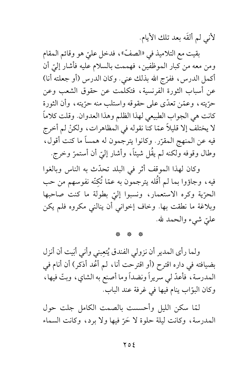 بقيت مع التلاميذ في «الصفّ»، فدخل عليّ هو وقائم المقام ومن معه من كبار الموظفين، فهممت بالسلام عليه فأشار إليّ أن أكمل الدرس، ففرّج الله بذلك عني. وكان الدرس (أو جعلته أنا) عن أسباب الثورة الفرنسية، فتكلمت عن حقوق الشعب وعن حرّيته، وعمّن تعدّى على حقوقه واستلب منه حرّيته، وأن الثورة كانت هي الجواب الطبيعي لهذا الظلم وهذا العدوان. وقلت كلاماً لا يختلف إلا قليلاً عمّا كنا نقوله في المظاهرات، ولكنْ لم أخرج فيه عن المنهج المقرّر. وكانوا يترجمون له همساً ما كنت أقول، وطال وقوفه ولكنه لم يقُل شيئاً، وأشار إليّ أن أستمرّ وخرج.