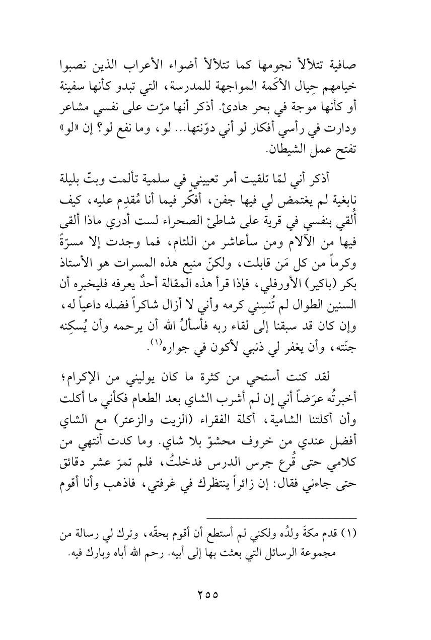 صافية تتلألأ نجومها كما تتلألأ أضواء الأعراب الذين نصبوا خيامهم حِيال الأكَمة المواجهة للمدرسة، التي تبدو كأنها سفينة أو كأنها موجة في بحر هادئ. أذكر أنها مرّت على نفسي مشاعر ودارت في رأسي أفكار لو أني دوّنتها ... لو، وما نفع لو؟ إن «لو» تفتح عمل الشيطان.