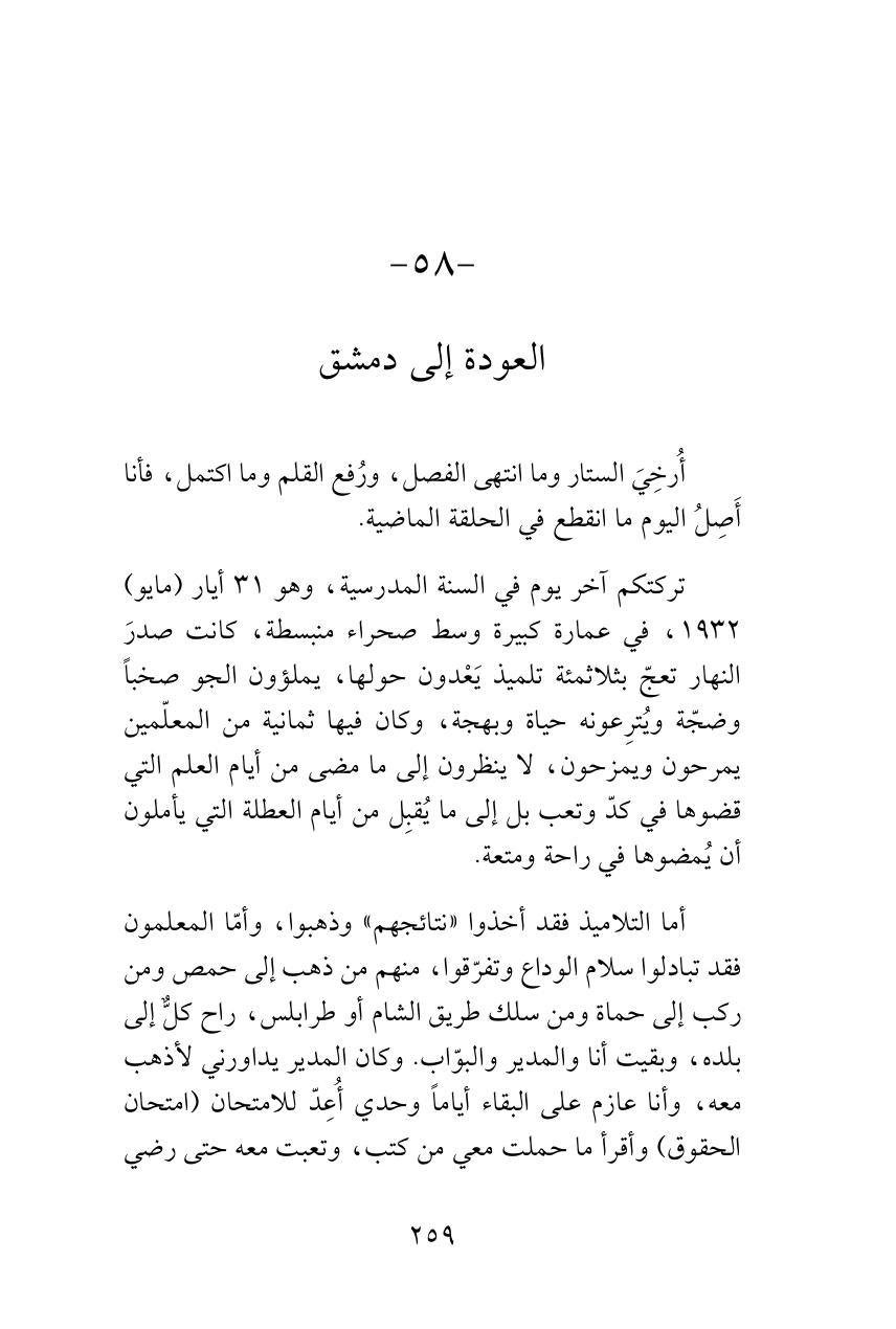 تركتكم آخر يوم في السنة المدرسية، وهو 31 أيار (مايو) 1932، في عمارة كبيرة وسط صحراء منبسطة، كانت صدرَ النهار تعجّ بثلاثمئة تلميذ يَعْدون حولها، يملؤون الجو صخباً وضجّة ويُترِعونه حياة وبهجة، وكان فيها ثمانية من المعلّمين يمرحون ويمزحون، لا ينظرون إلى ما مضى من أيام العلم التي قضوها في كدّ وتعب بل إلى ما يُقبِل من أيام العطلة التي يأملون أن يُمضوها في راحة ومتعة.
