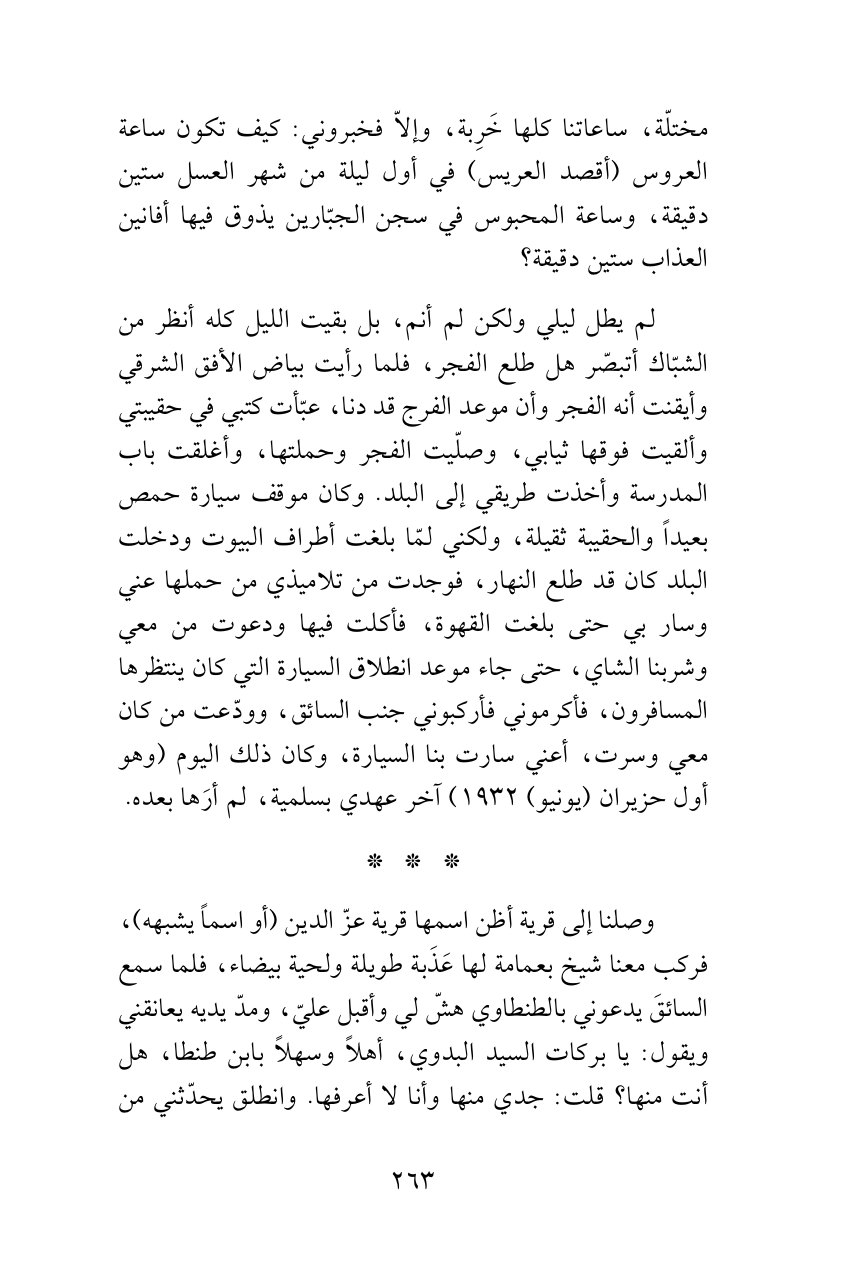 وصلنا إلى قرية أظن اسمها قرية عزّ الدين (أو اسماً يشبهه)، فركب معنا شيخ بعمامة لها عَذَبة طويلة ولحية بيضاء، فلما سمع السائقَ يدعوني بالطنطاوي هشّ لي وأقبل عليّ، ومدّ يديه يعانقني ويقول: يا بركات السيد البدوي، أهلاً وسهلاً بابن طنطا، هل أنت منها؟ قلت: جدي منها وأنا لا أعرفها. وانطلق يحدّثني من