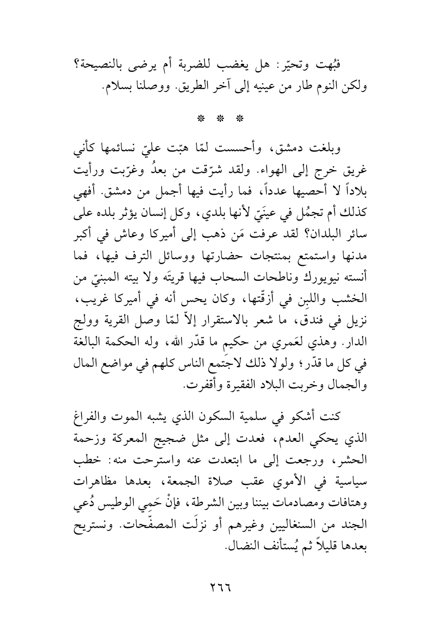 وبلغت دمشق، وأحسست لمّا هبّت عليّ نسائمها كأني غريق خرج إلى الهواء. ولقد شرّقت من بعدُ وغرّبت ورأيت بلاداً لا أحصيها عدداً، فما رأيت فيها أجمل من دمشق. أفهي كذلك أم تجمُل في عينَيّ لأنها بلدي، وكل إنسان يؤثر بلده على سائر البلدان؟ لقد عرفت مَن ذهب إلى أميركا وعاش في أكبر مدنها واستمتع بمنتجات حضارتها ووسائل الترف فيها، فما أنسته نيويورك وناطحات السحاب فيها قريتَه ولا بيته المبنيّ من الخشب واللبِن في أزقّتها، وكان يحس أنه في أميركا غريب، نزيل في فندق، ما شعر بالاستقرار إلاّ لمّا وصل القرية وولج الدار. وهذي لعَمري من حكيمِ ما قدّر الله، وله الحكمة البالغة في كل ما قدّر؛ ولولا ذلك لاجتمع الناس كلهم في مواضع المال والجمال وخربت البلاد الفقيرة وأقفرت.