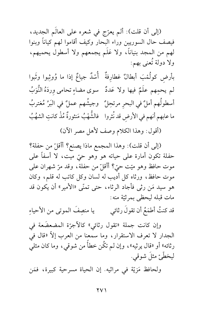 وإن كانت جملة «تقول رثائي» كالآجرّة المضعضَعة في الجدار لا تعرف الاستقرار، وما سمعنا من العرب إلاّ «قال في رثائه» أو «قال يرثيه»، وإن لم تكُن خطأً من شوقي، وما كان مثلي ليخطّئ مثلَ شوقي.